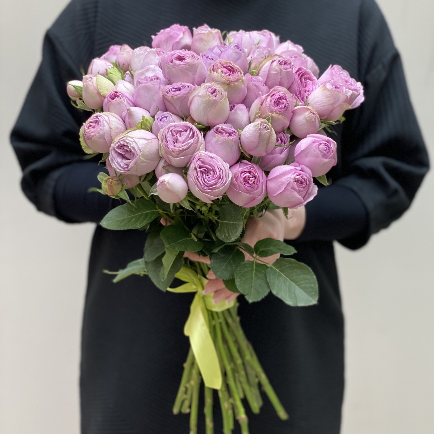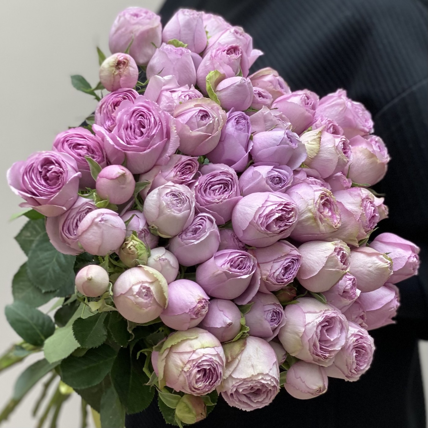 На фото букет из 15 кустовых роз сорта Lavender Lace