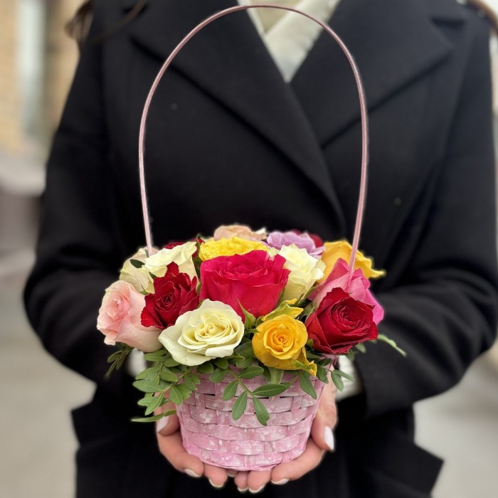 Состав роза белая - 3 шт, роза Топ Гир - 3 шт, роза желтая - 3 шт, роза розовая - 2 шт, роза малиновая - 1 шт, роза сиреневая - 1 шт, роза красная - 6 шт, писташ, оазис, корзина с высокой ручкой.
