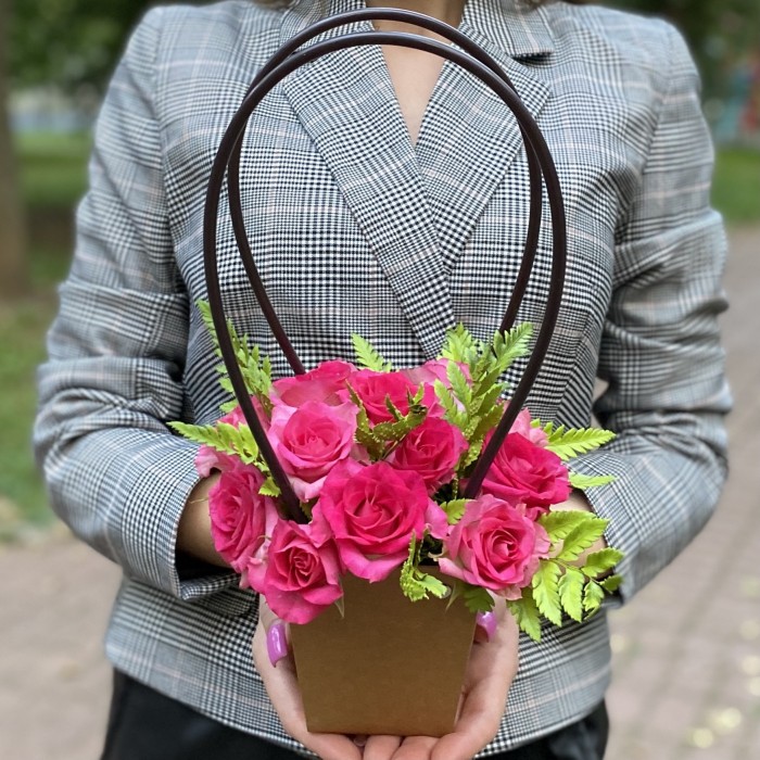 Композиция из малиновых кустовых роз сорта Рупски с добавлением папоротника в стильном пакете сумочке. Это отличный подарок учителю на 1 сентября или подруге на день рождения. Доставляем букеты и композиции по Москве и Подмосковью круглосуточно!