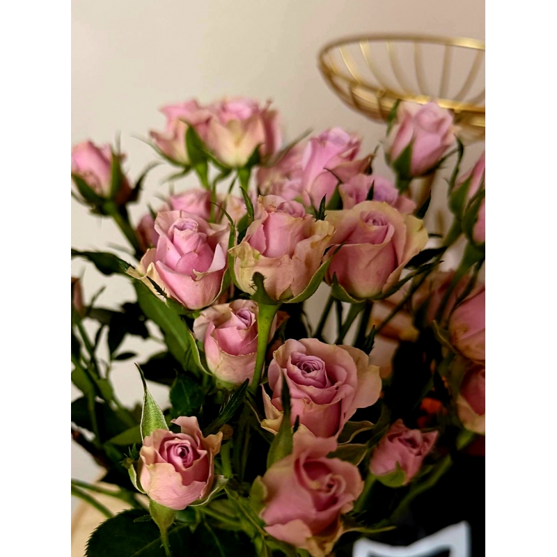 Кустовая роза сорта Сильвер Шедоу. Роза имеет сиреневый цвет, на ветке около 7-9 бутонов. На фото представлено 15 веток.