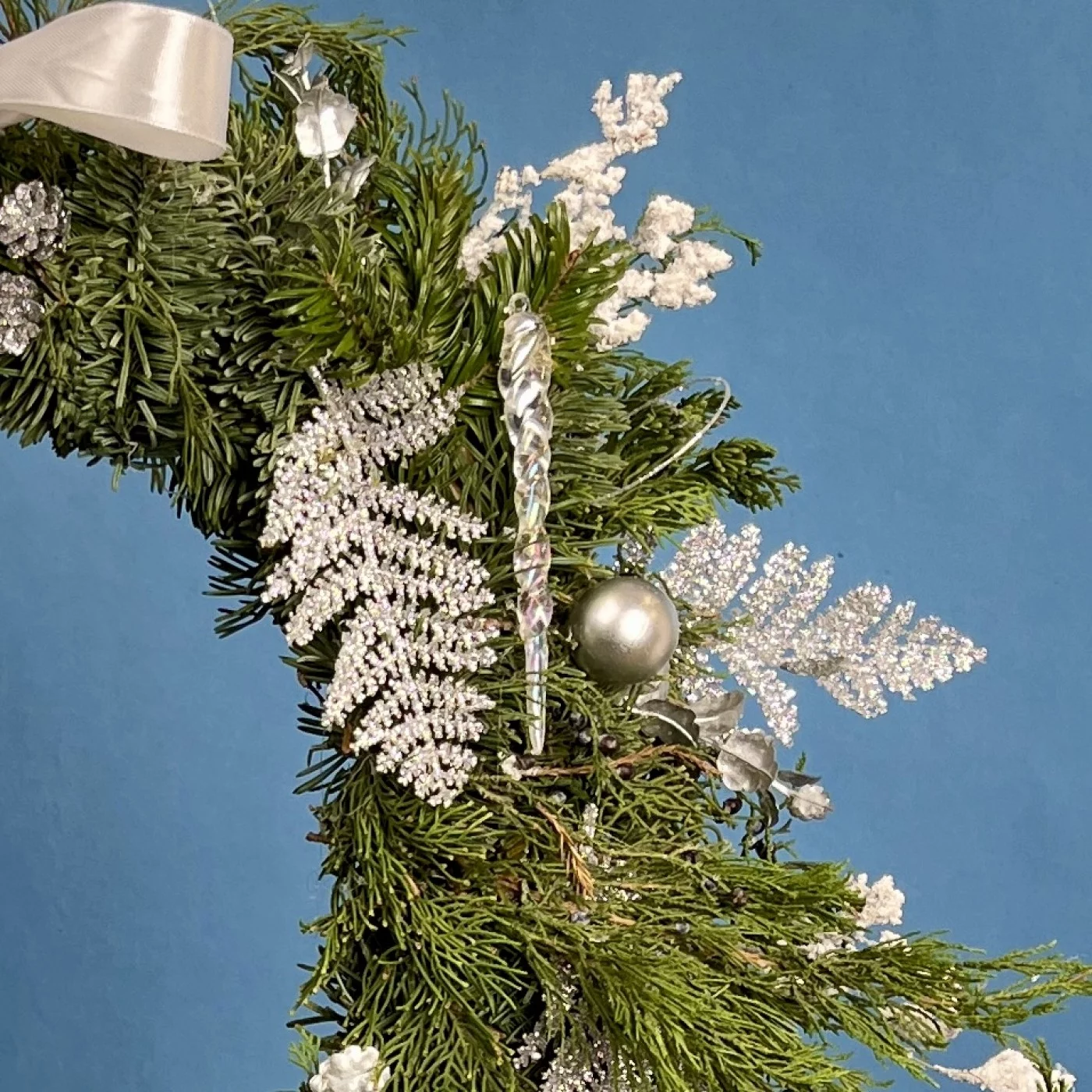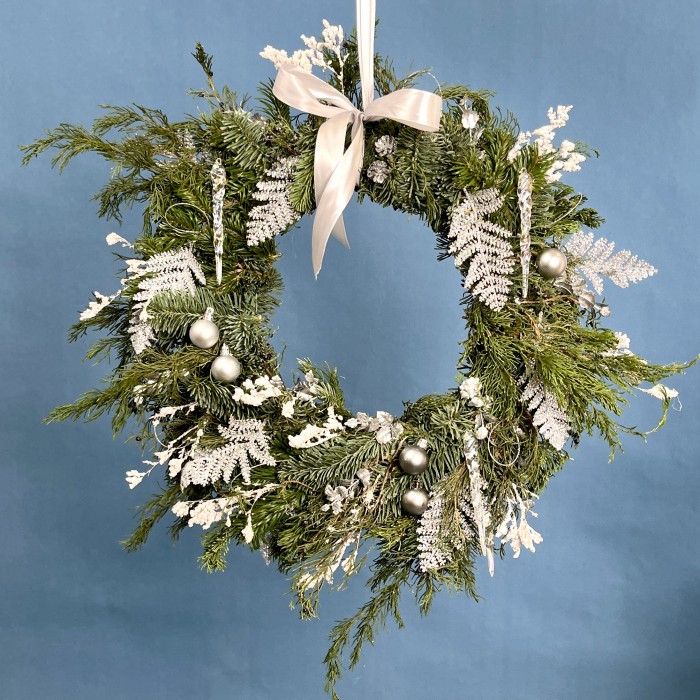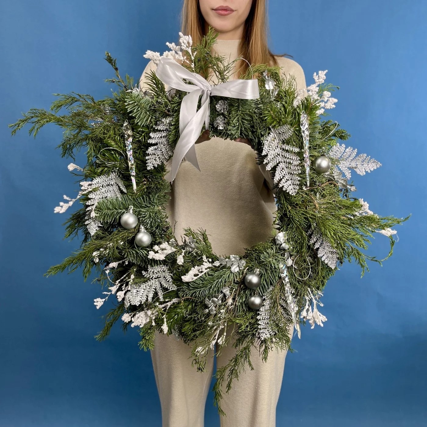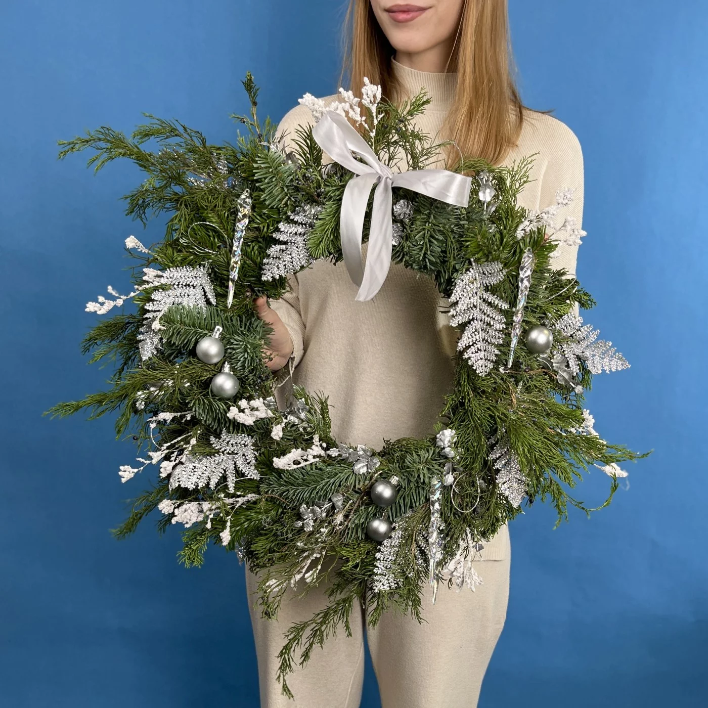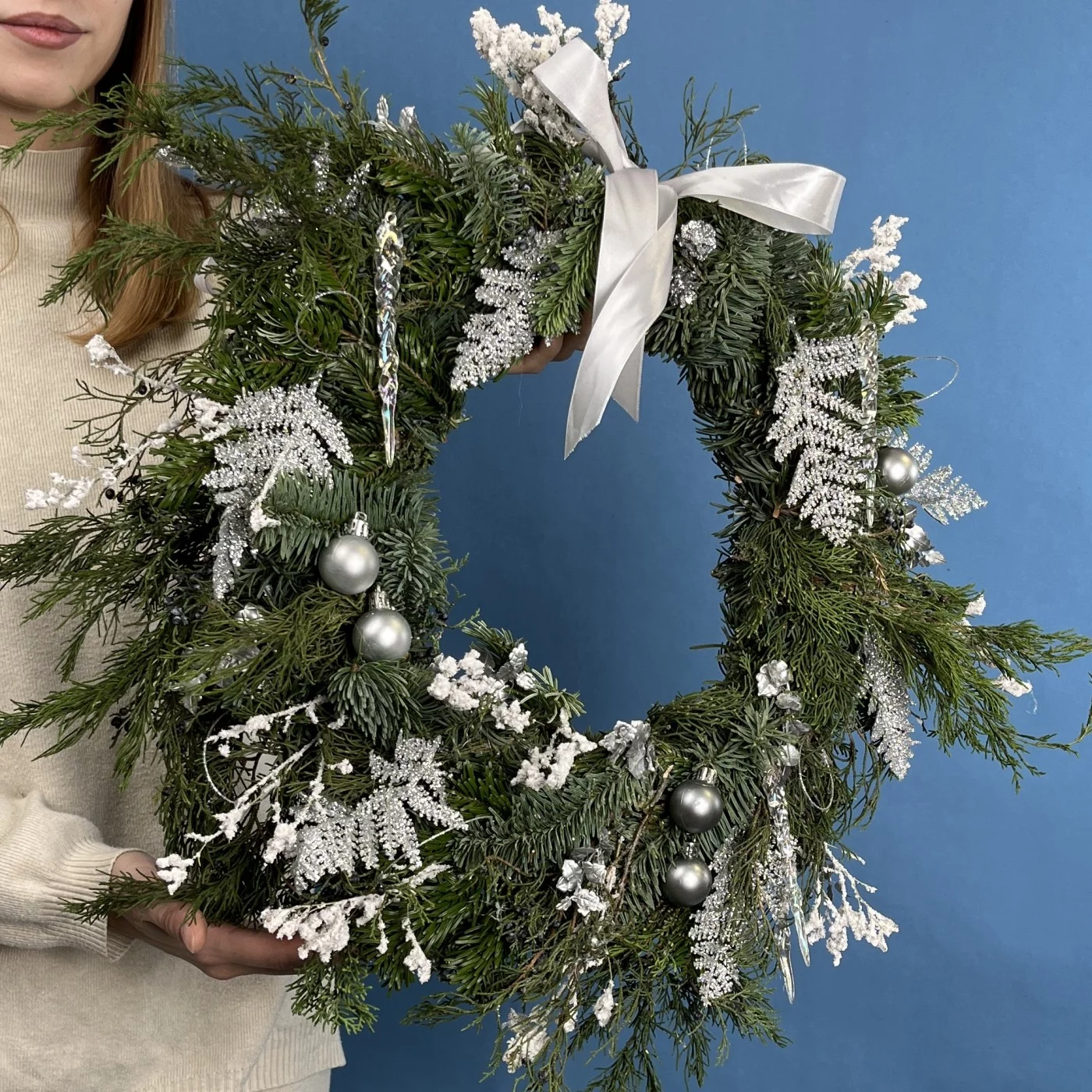 Рождественский венок с серебряным декором станет ярким акцентом в вашем праздничном оформлении и будет радовать глаз на протяжении всего зимнего сезона. Этот венок можно использовать не только для украшения дверей, но и как элемент декора на стенах или в интерьере.