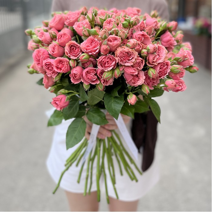 Коралловая кустовая пионовидная роза Спешел Дайменшн, 50 см, с крупными пышными цветами и необычными бутонами — яркий и романтичный акцент в любой композиции.