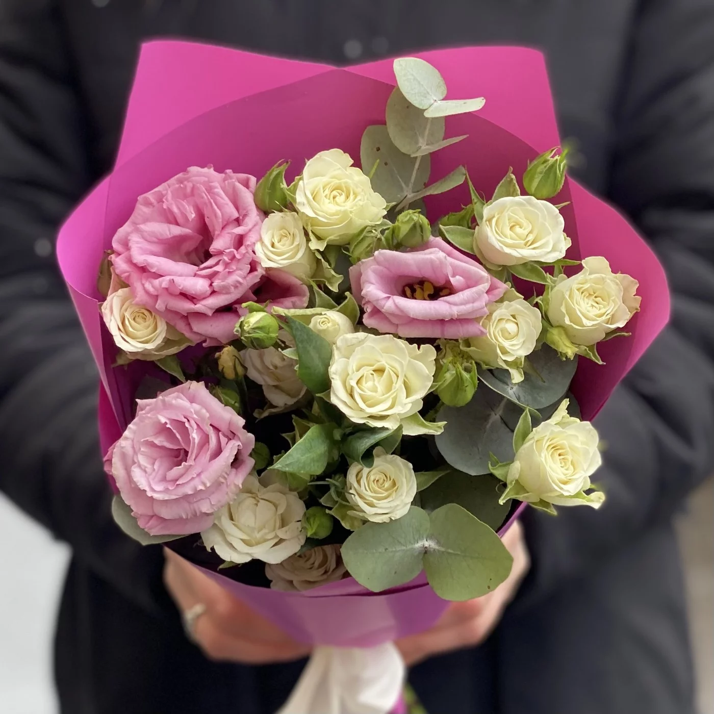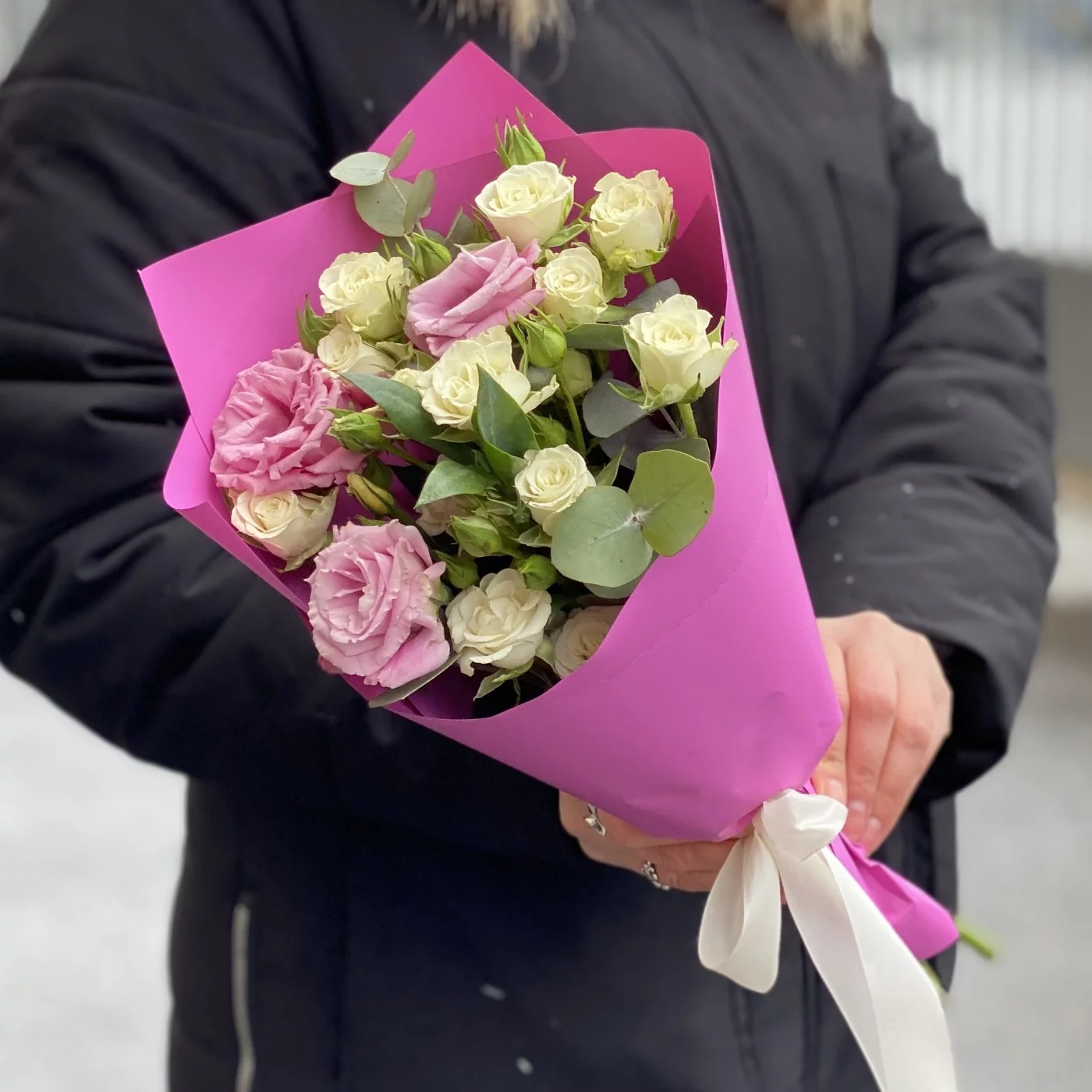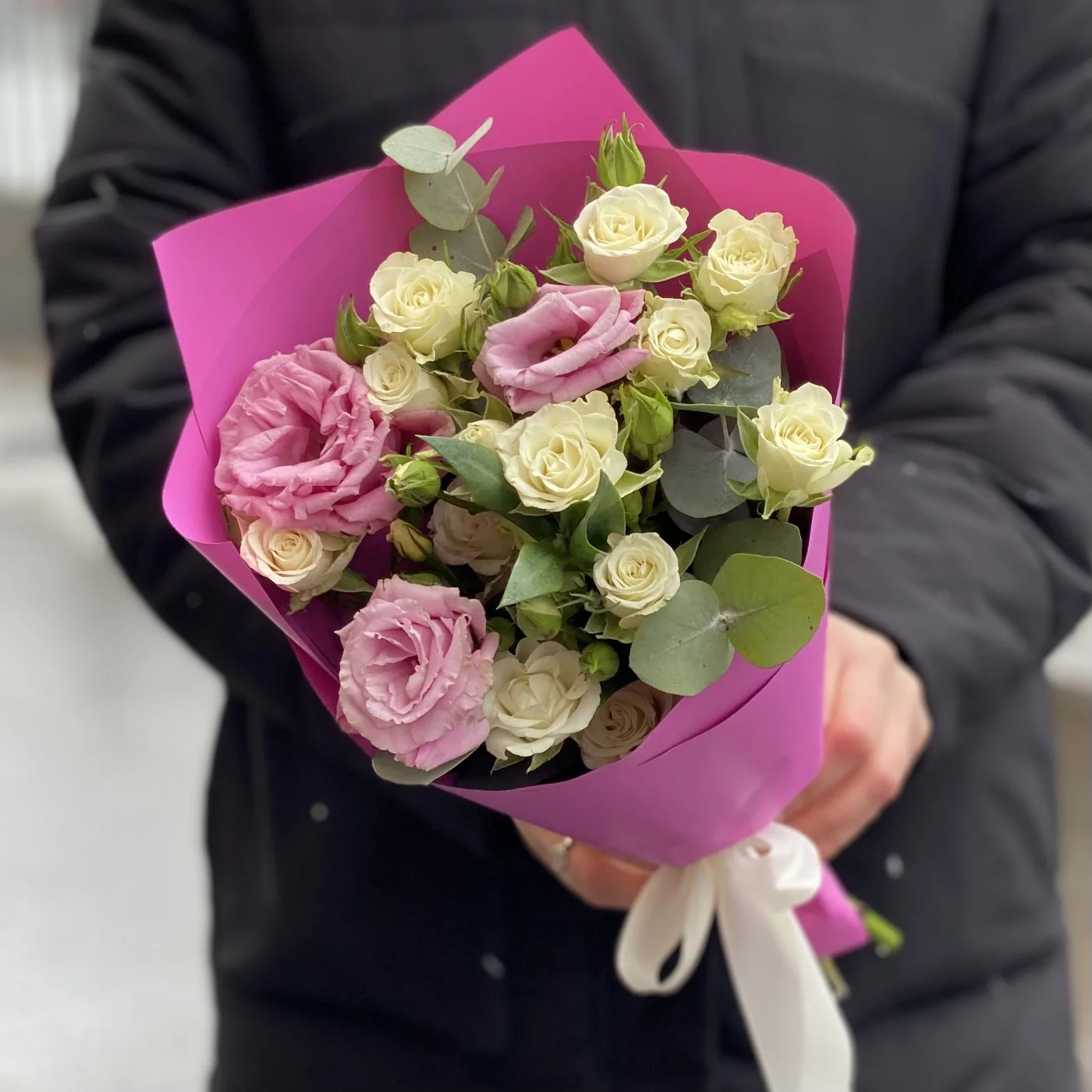 Цветочная композиция бело-розовый микс кустовой розы и эустомы — это идеальный сюрприз для самых очаровательных девушек, композиция подарит им множество приятных эмоций. Белоснежные бутоны розы символизируют чистоту намерений, а нежно-розовые соцветия лизиантуса подчеркивают романтичный и трепетный посыл, который несет в себе этот роскошный букет. Он лучше сотни слов расскажет о теплых, трепетных чувствах, которые даритель хотел бы выразить получательнице этого подарка.