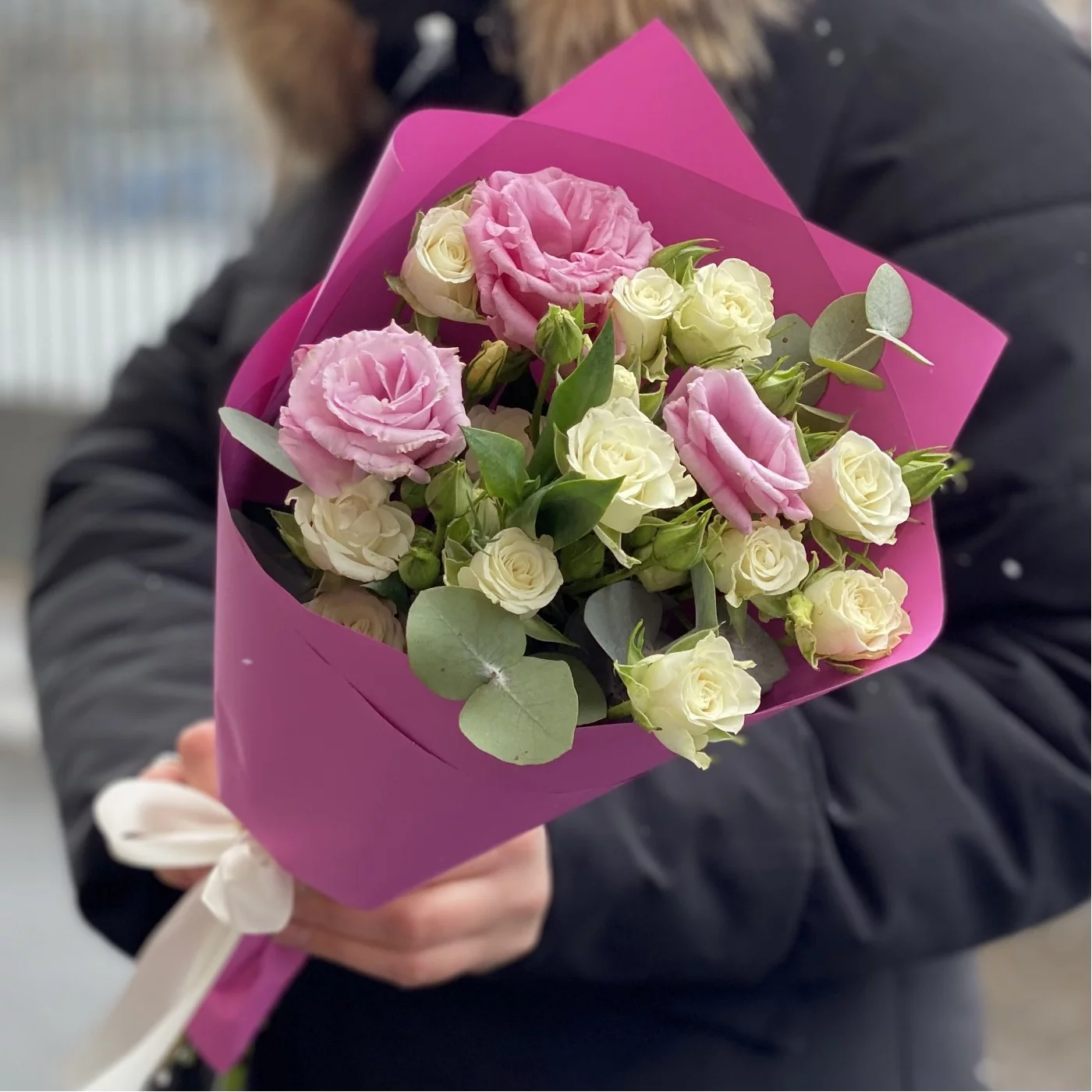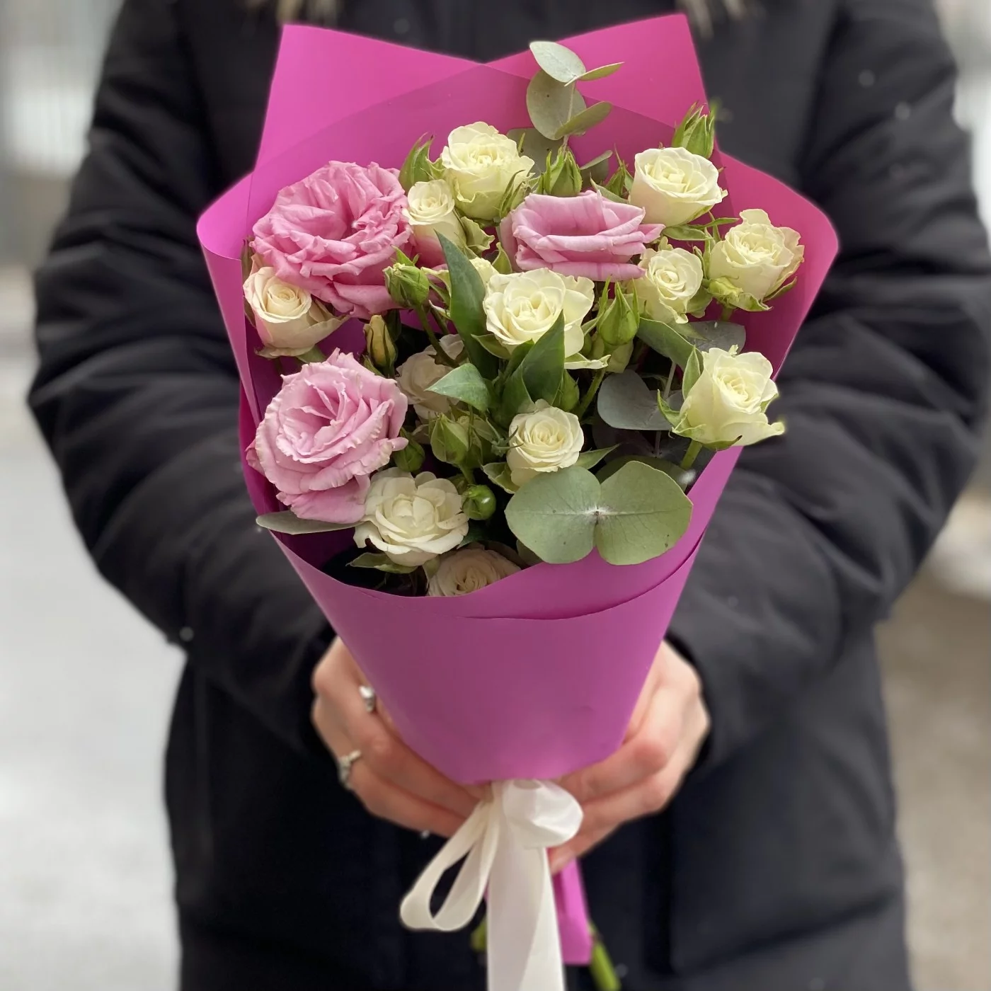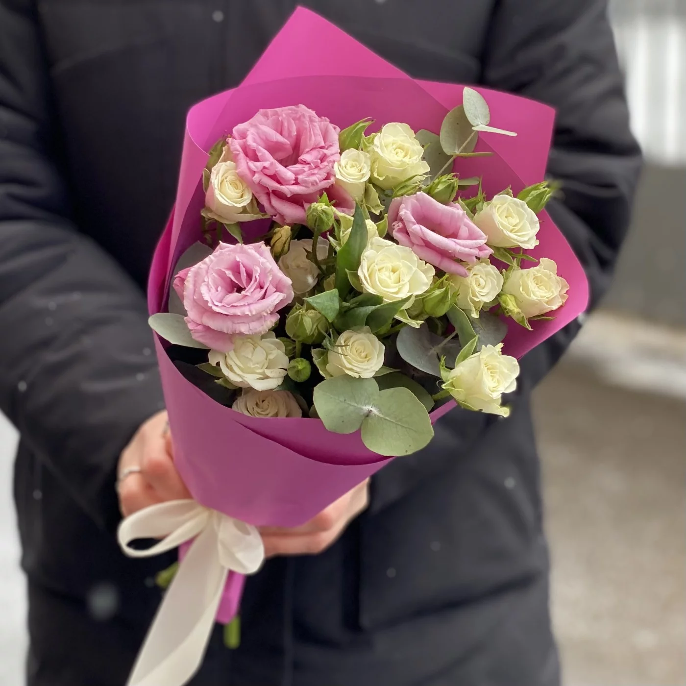 Цветочная композиция бело-розовый микс кустовой розы и эустомы — это идеальный сюрприз для самых очаровательных девушек, композиция подарит им множество приятных эмоций. Белоснежные бутоны розы символизируют чистоту намерений, а нежно-розовые соцветия лизиантуса подчеркивают романтичный и трепетный посыл, который несет в себе этот роскошный букет. Он лучше сотни слов расскажет о теплых, трепетных чувствах, которые даритель хотел бы выразить получательнице этого подарка.