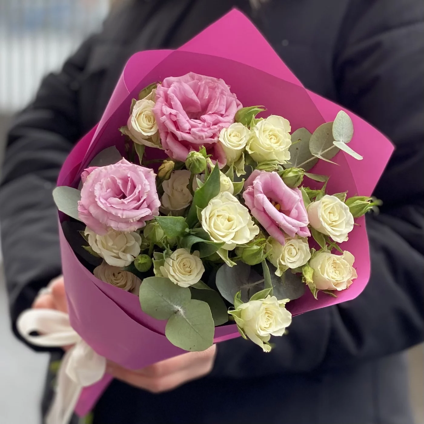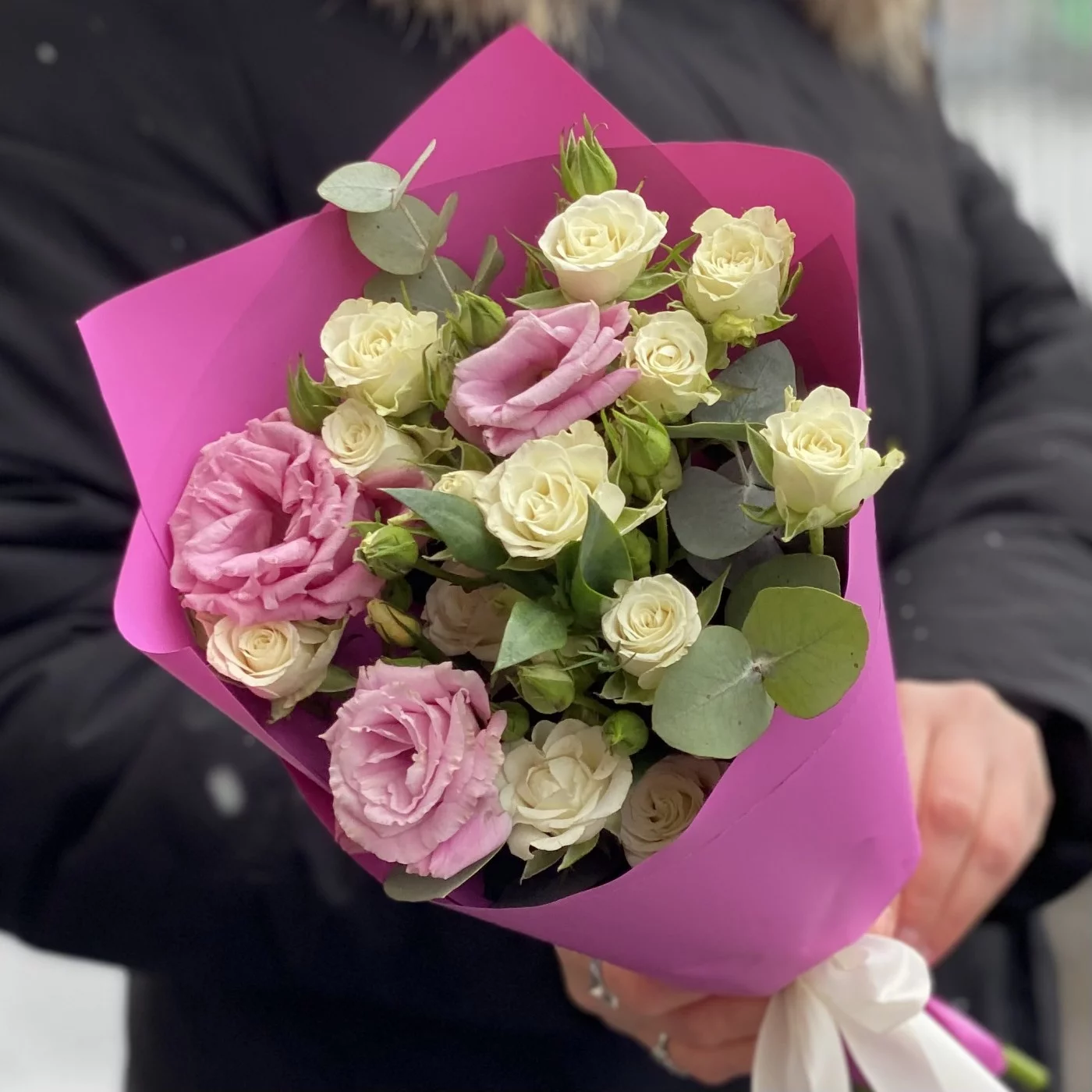 Купить букет из кустовых роз и эустомы в бело-розовой цветовой гамме в один клик можно на нашем сайте. Предлагаем всегда свежие и красивые цветы, доставляем букеты круглосуточно по Москве и области. По Вашему желанию дополним композицию бесплатной открыткой, куда впишем ваш текст.