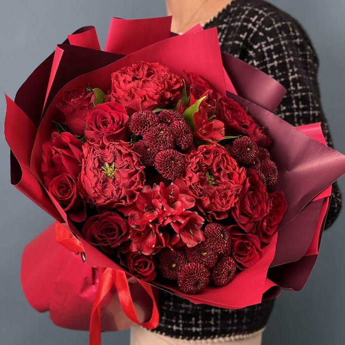 Рубиновый букет — это яркий и насыщенный подарок, который отлично подходит для юбилея.