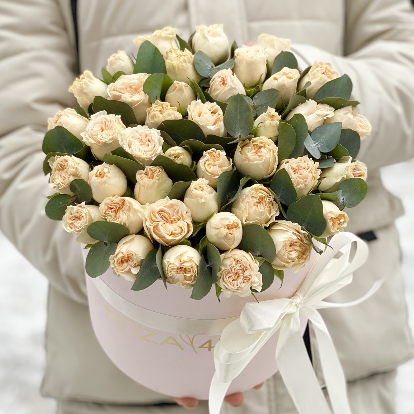 Ощутите красоту и элегантность нашего потрясающего букета! Это идеальное сочетание девяти Саммер-роз и двух свежих веток эвкалипта. Шляпная коробка, перевязанная гладкой атласной лентой, делает подарок ещё более продуманным и элегантным.