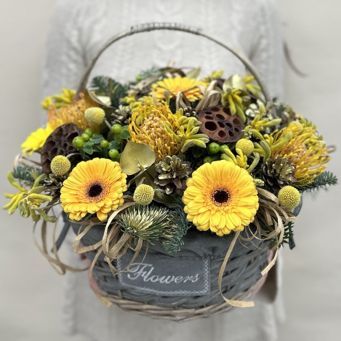 Сборная корзина с герберами — это яркая и жизнеутверждающая композиция, которая привносит в атмосферу радость и позитив. Герберы делают эту композицию идеальным подарком для праздников, дней рождения или просто для поднятия настроения.