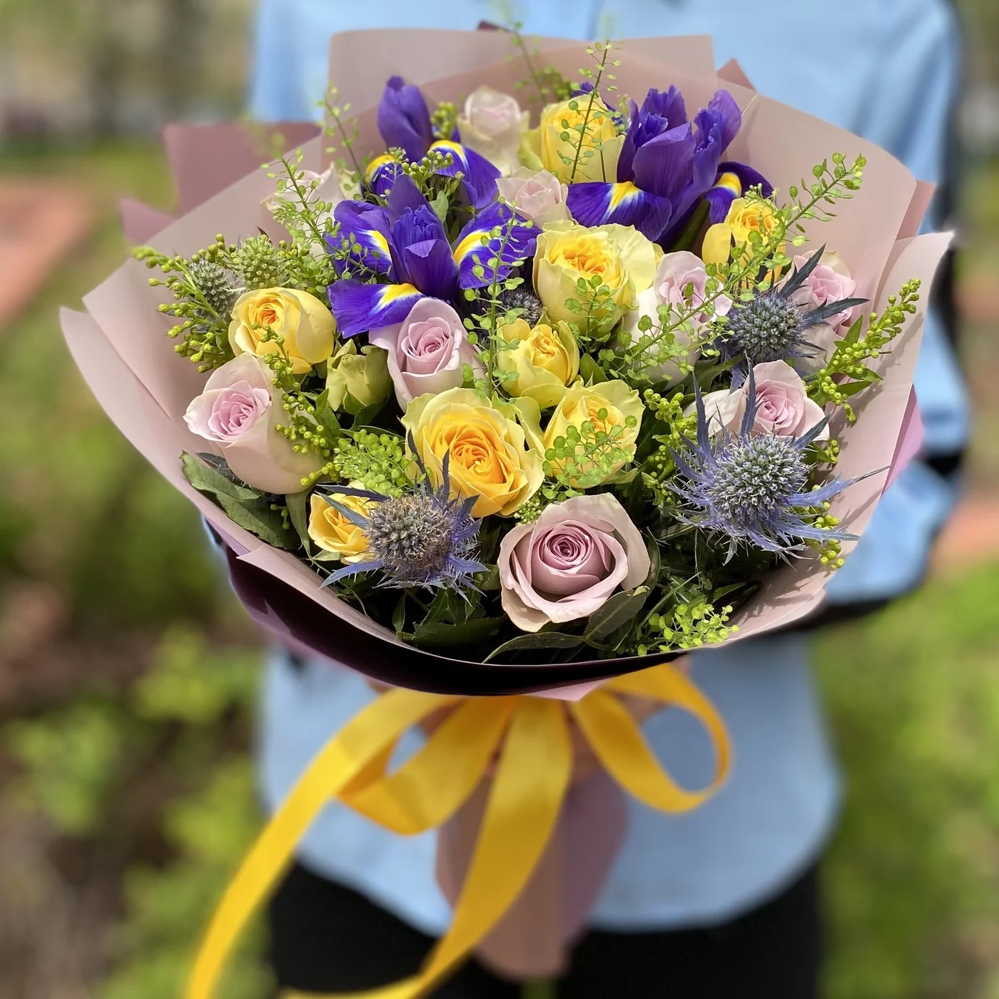 рис – 3, гринбел – 1, роза кустовая желтая – 3, солидаго – 1, роза сиреневая – 9, писташ – 2, эрингиум – 1, упаковка.