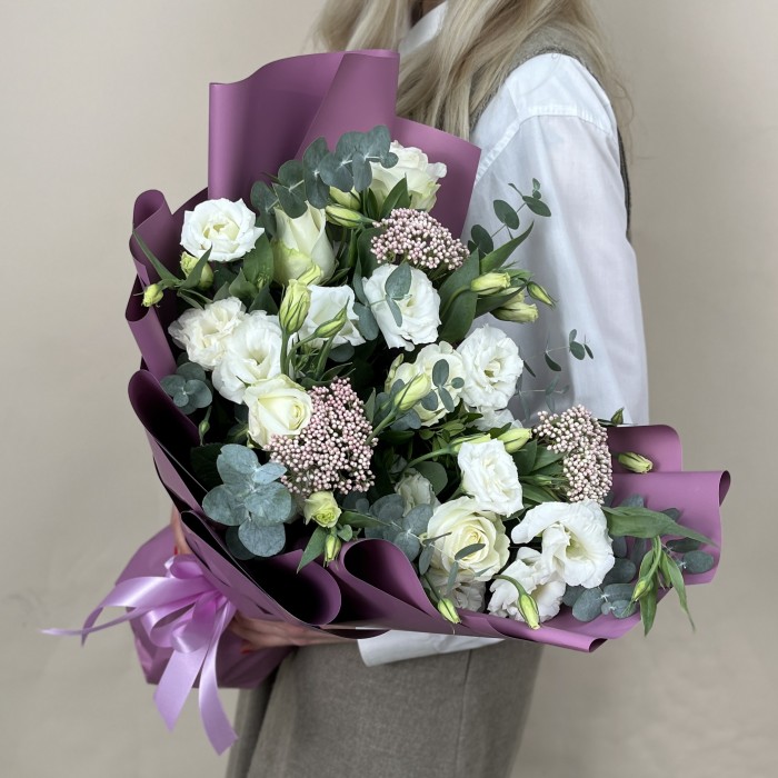 Сборный букет из белых роз и эустомы