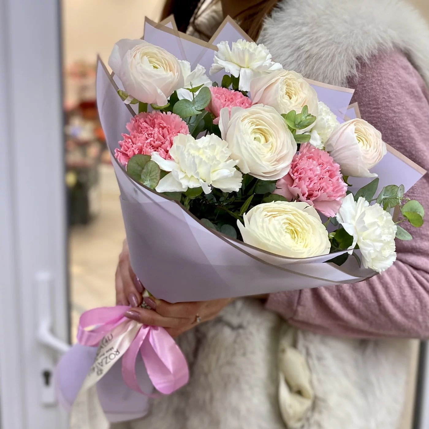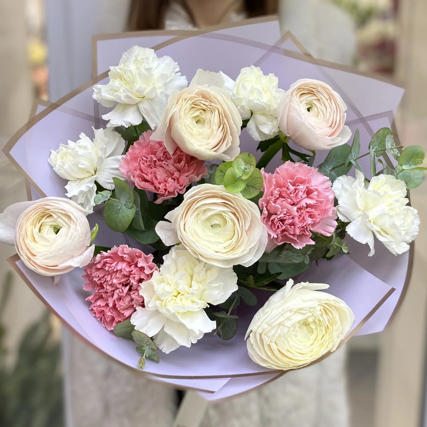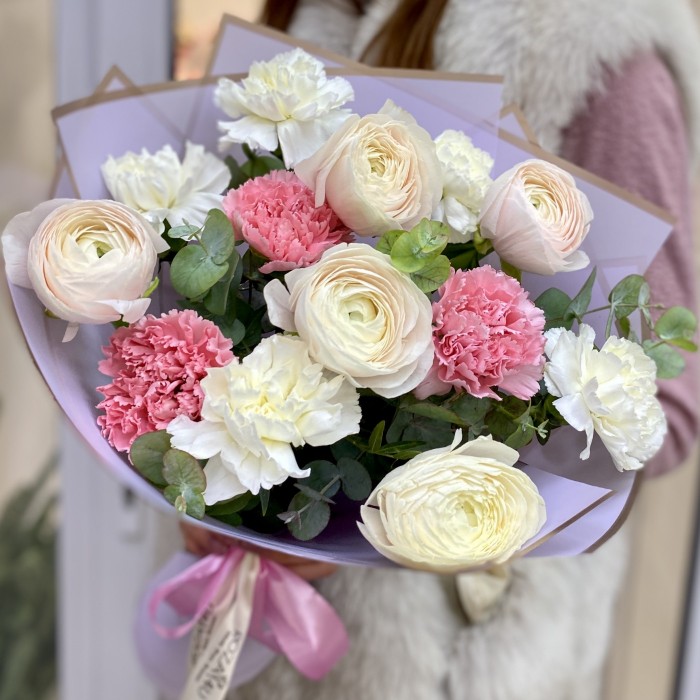 Букет из нежных ранункулюсов и диантусов. В состав букета входит ароматный эвкалипт. Букет упакован в мягкую тишью и стильную корейскую пленку. Такой букет подойдет для подарка на день рождения жене, подруге или маме.