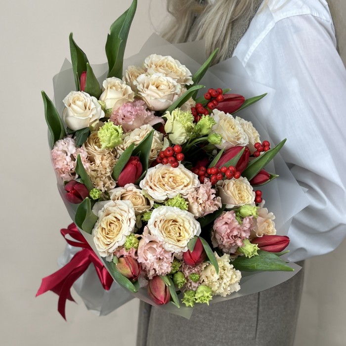 Сборный букет с эустомой и красными тюльпанами