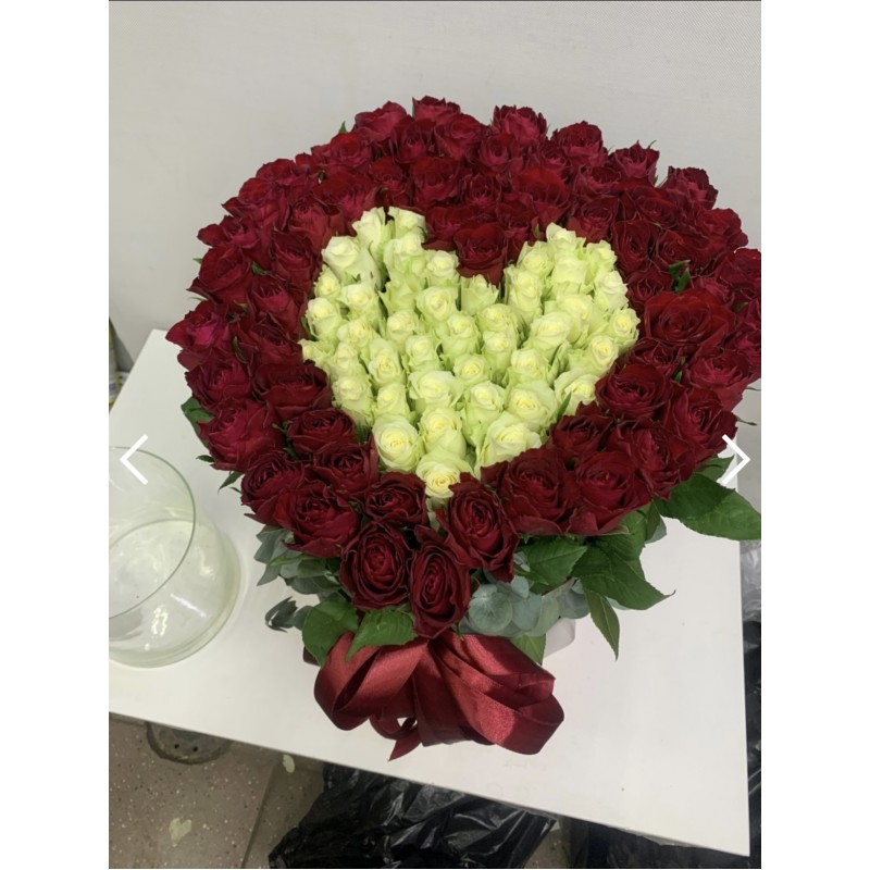 Сердце из красных и белых роз в коробке