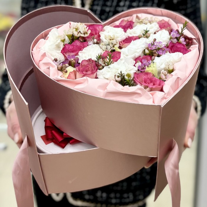 Коробка-трансформер необычного розово-перламутрового цвета. Коробка состоит из двух раздвижных частей. В верхней части композиция из цветов, в нижней части свободное пространство, которое вы можете наполнить конфетами либо вложить туда свой особенный подарок.