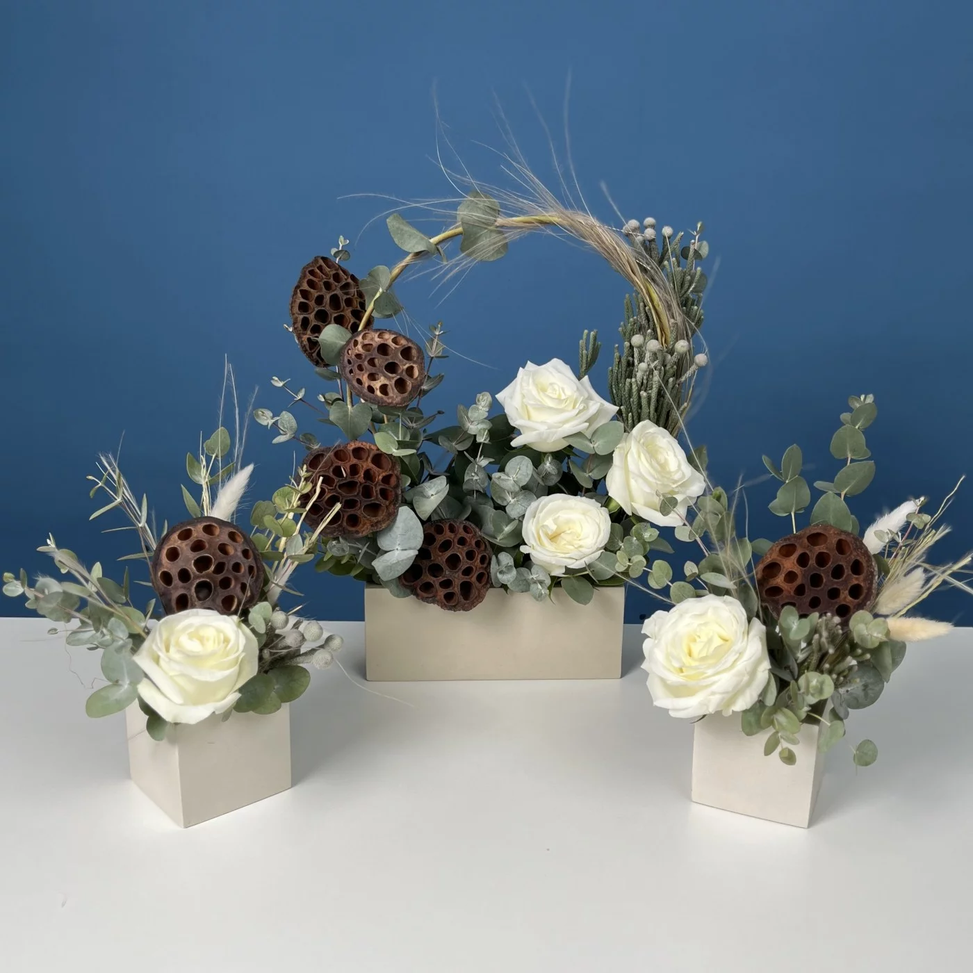Этот изысканный набор из трех авторских интерьерных букетов создает гармонию стиля и свежести в вашем пространстве.