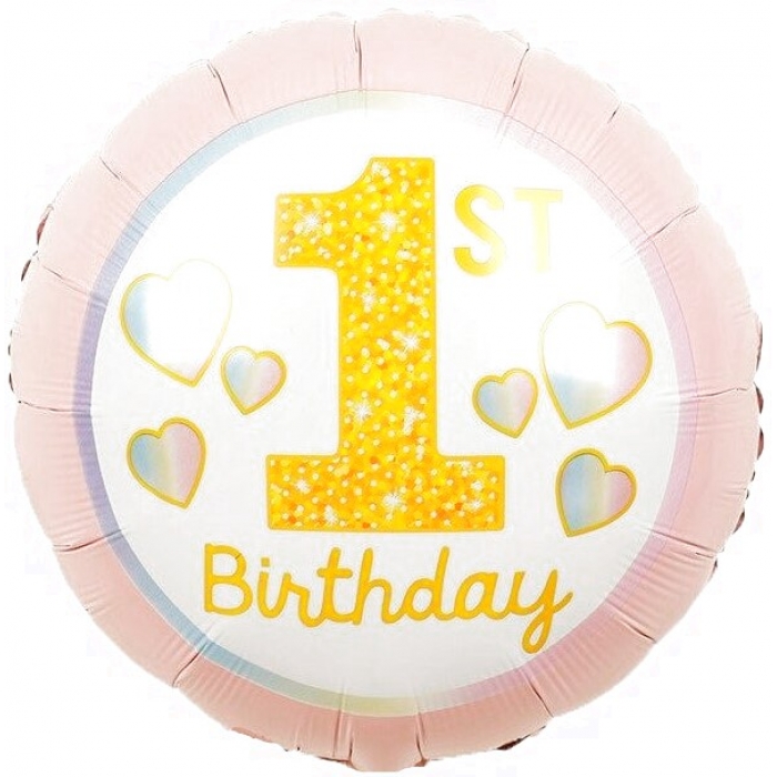 Шар фольгированный круг, 1-й День Рождения Девочки, радужные сердечки, розового цвета, прекрасно дополнит ваш букет и создаст праздничное настроение.