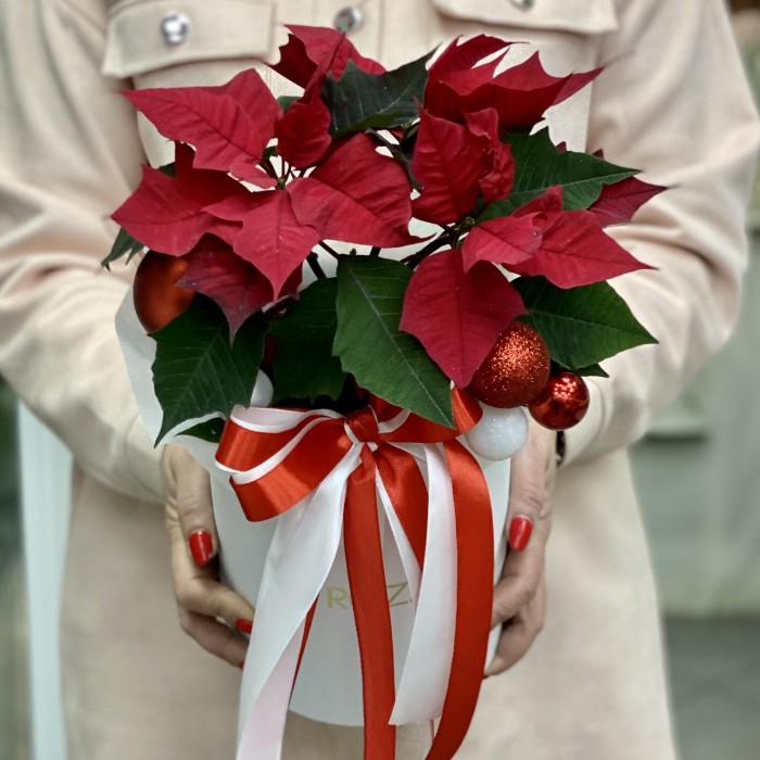 Необычная праздничная пуансеттия в шляпной коробке, украшенной декоративными ветками и ёлочными шарами. Отличная альтернатива подарку или презенту при походе в гости на новогодних каникулах.