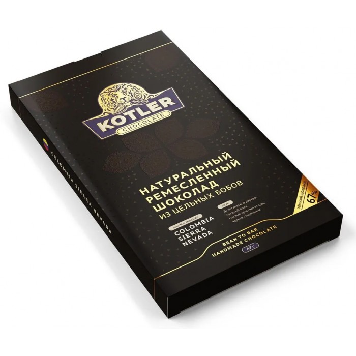 Шоколад горький бренда KOTLER Choсolate "COLOMBIA SIERRA NEVADA". Котлер шоколад произведен по технологиям Bean-to-bar. Производится по технологии 19 века, которая позволяет изготавливать натуральный шоколад из бобов. Bean-to-bar (дословный перевод - от боба до плитки) - это технология изготовления шоколада в пределах одного производства, начиная с выбора какао-бобов, их обжарки, обработки и заканчивая упаковкой готовых плиток. Для изготовления Bean-to-bar шоколада, в отличие от фабричного, используются редкие и дорогие сорта какао-бобов, какао масло, полученное практически из них же холодным отжимом и нерафинированный тростниковый сахар с низким гликемическим индексом.