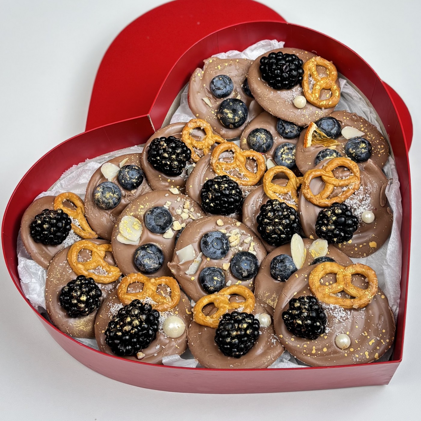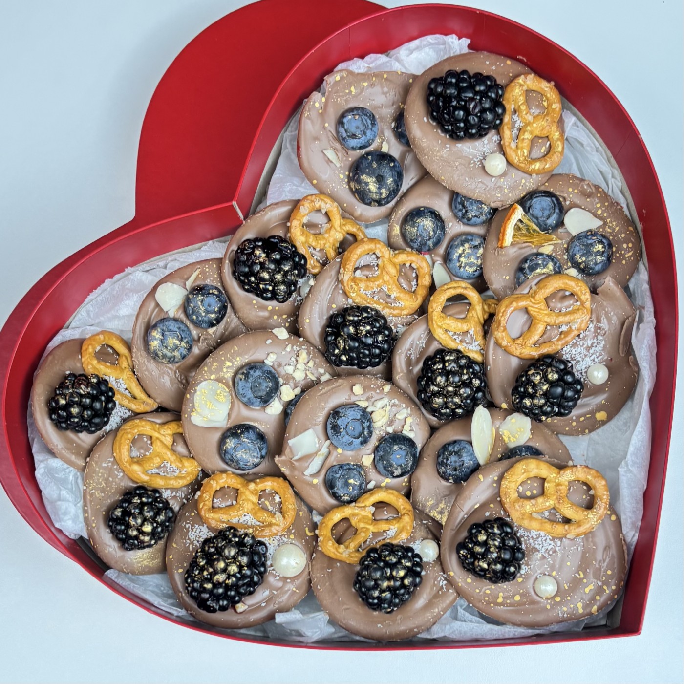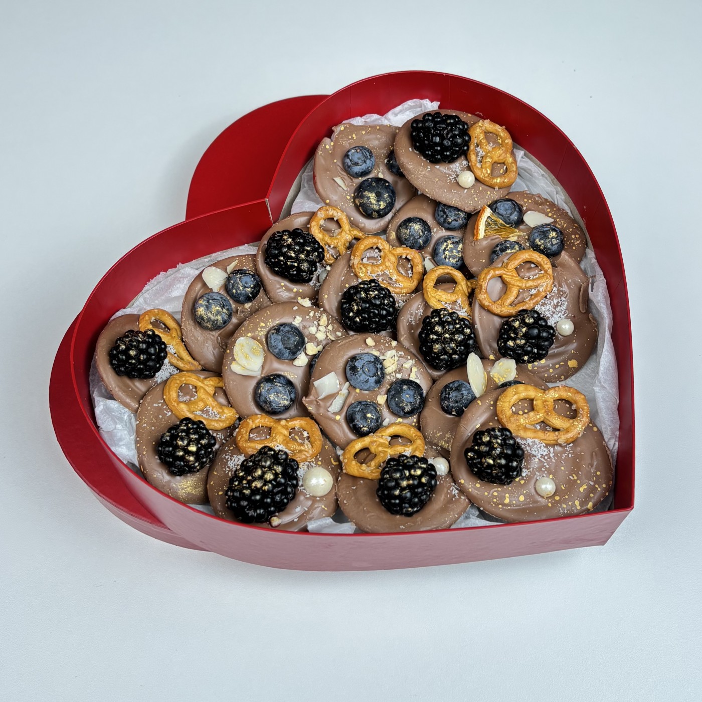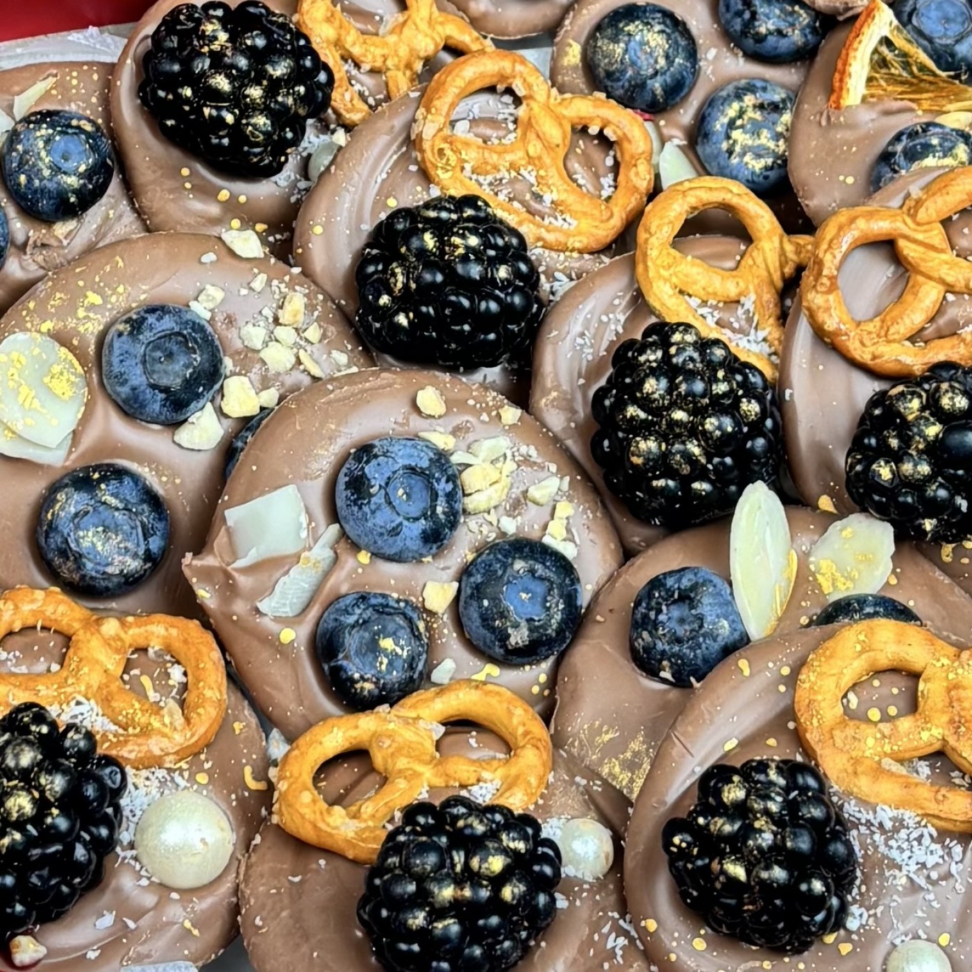 Молочный шоколад ручной работы с ежевикой, кокосовой стружкой, соленым кренделем, голубикой, миндальными лепестками, ореховой посыпкой. Очень вкусный и красивый подарок.