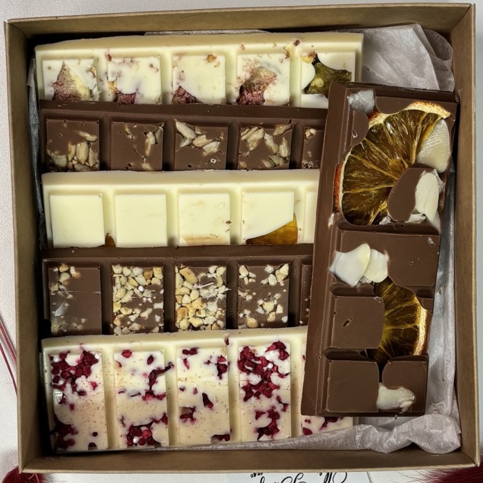Шоколад ручной работы. Белый и молочный бельгийский шоколад с сублимированными апельсинами, малиной и ореховой крошкой.