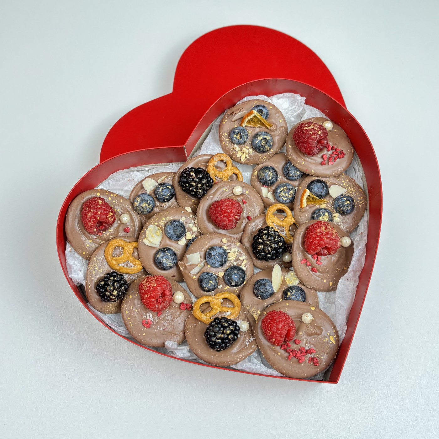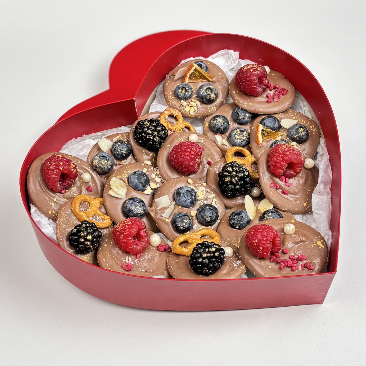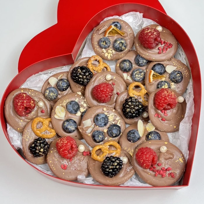 Молочный шоколад ручной работы с малиной, сублимированной малиной, сахарной посыпкой, ежевикой, кокосовой стружкой, соленым кренделем, голубикой, миндальными лепестками, ореховой посыпкой. Очень вкусный и красивый подарок.