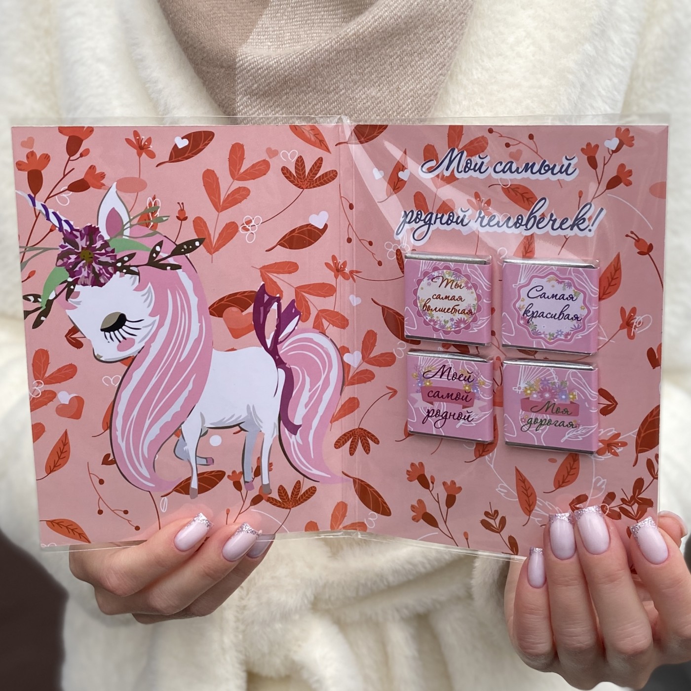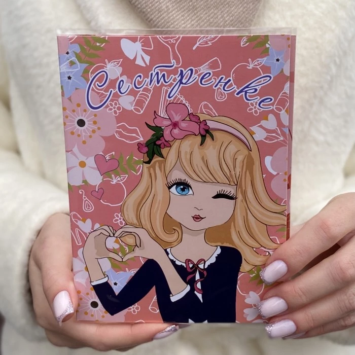 Внутри открытки теплые пожелания и вкусные шоколадки, которые обязательно порадуют Вашу сестричку.