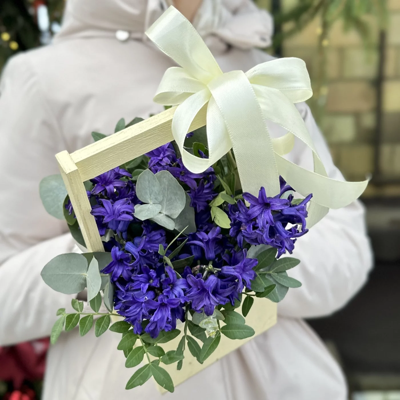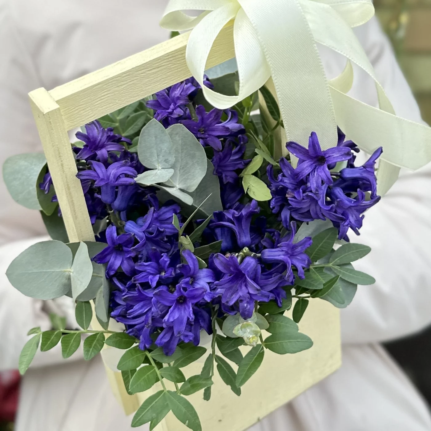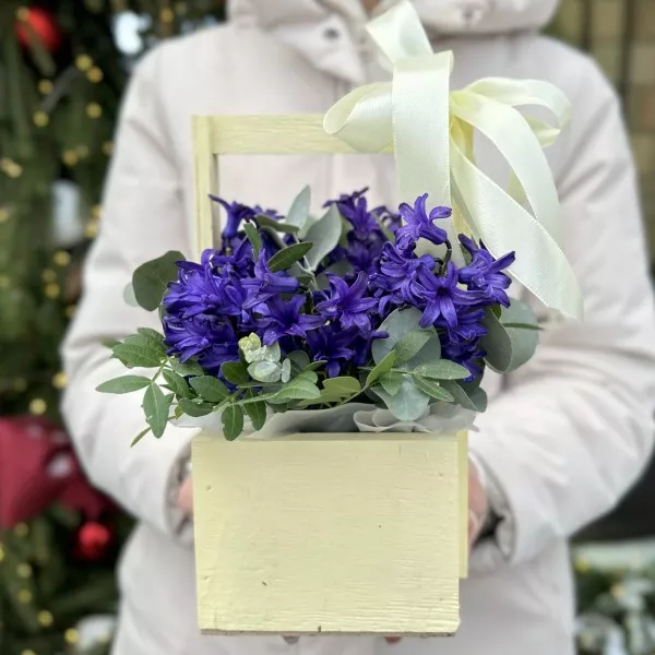 Синие гиацинты в деревянном ящике — это необычное и привлекательное украшение, которое добавляет романтическую и природную атмосферу в любое пространство.