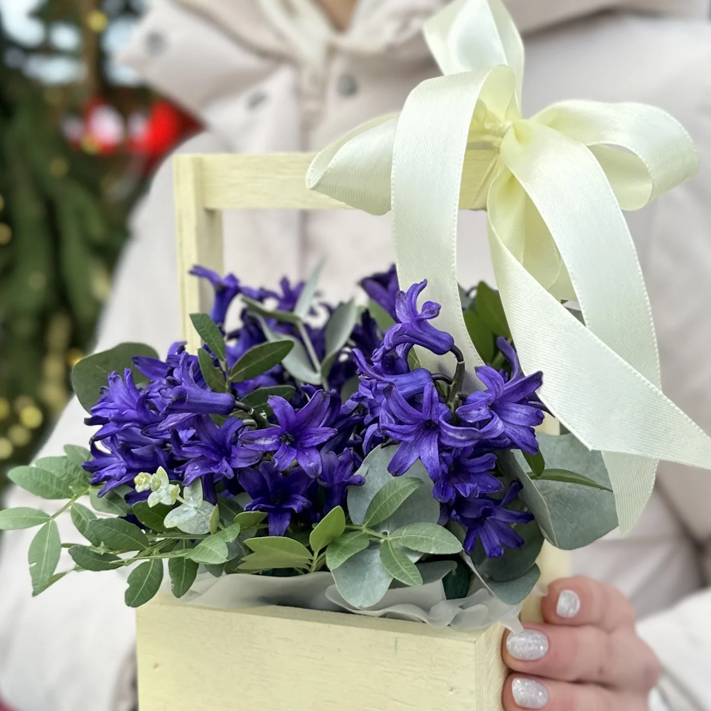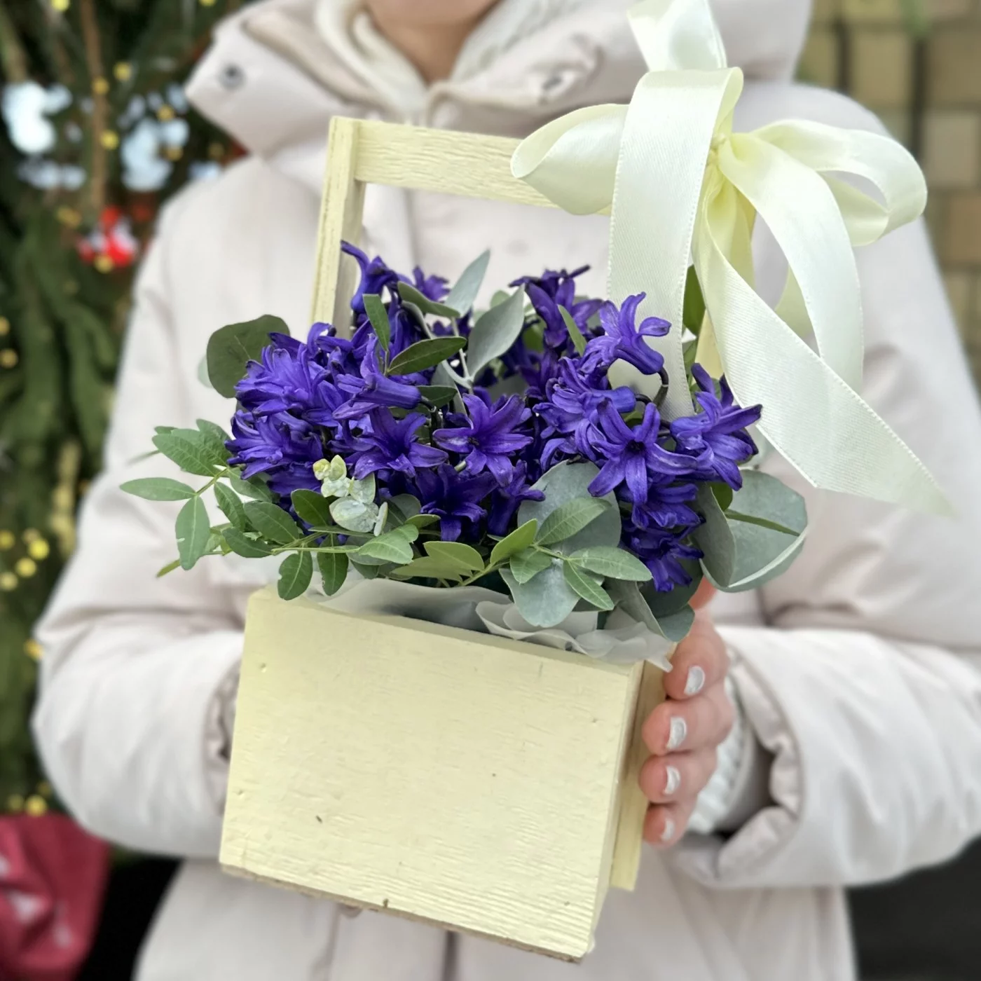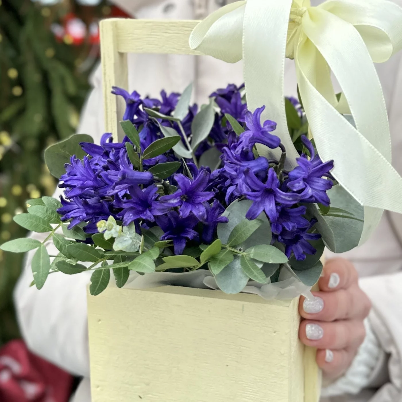 Синие гиацинты в деревянном ящике — это необычное и привлекательное украшение, которое добавляет романтическую и природную атмосферу в любое пространство.