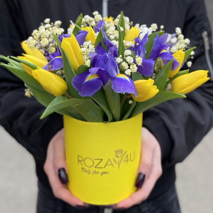Коробка с ароматными гиацинтами, ирисами и тюльпанами дополнена пышной гипсофилой. Преподнесите такую композиция в качестве подарка своим любимым.