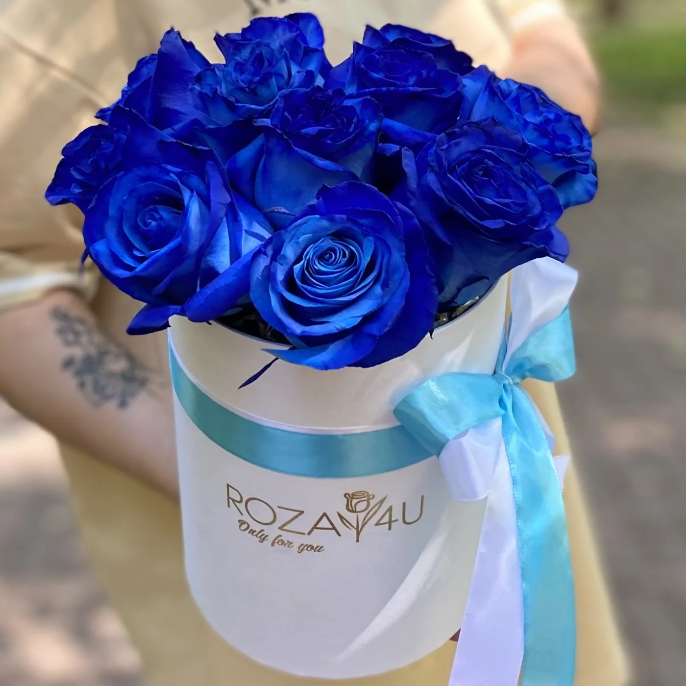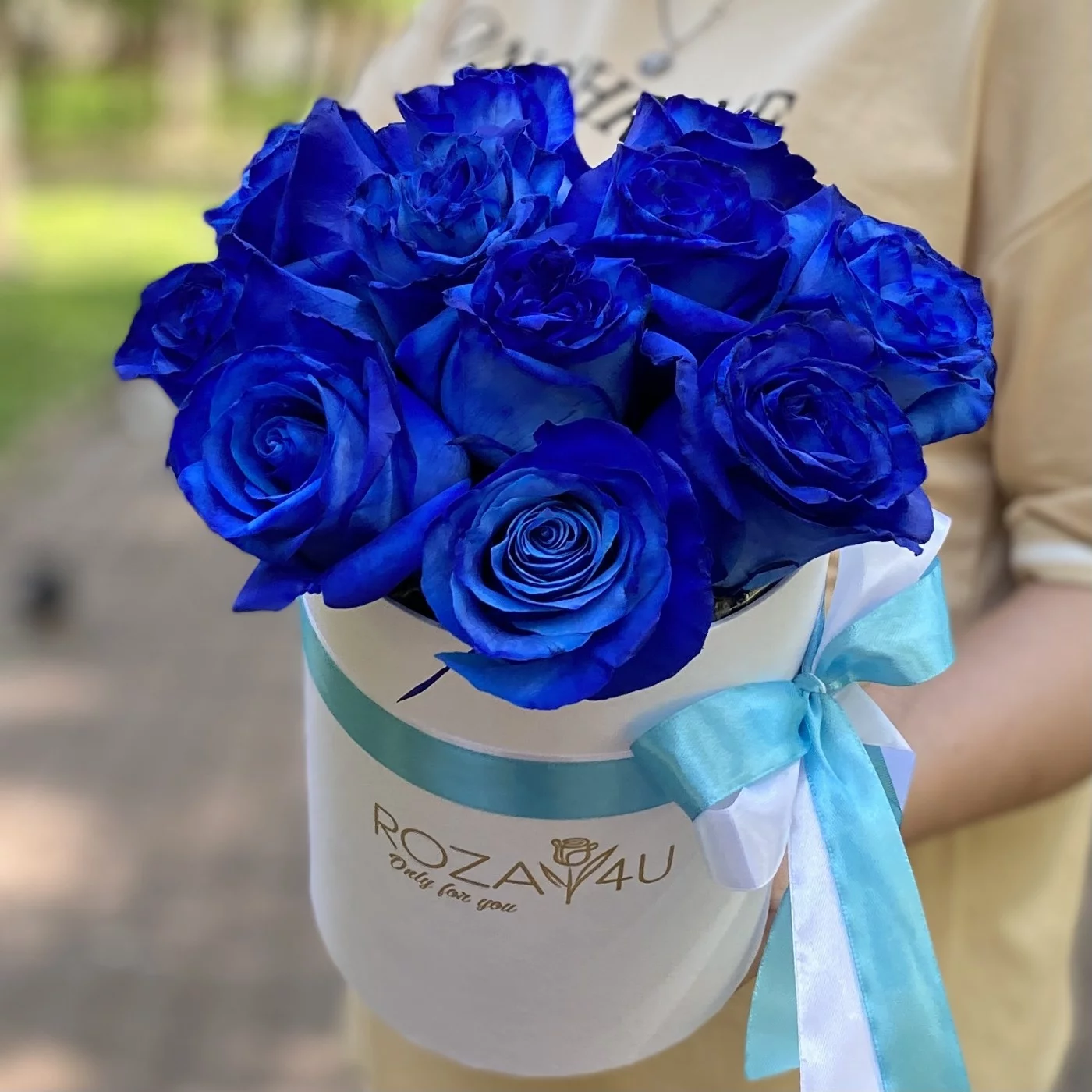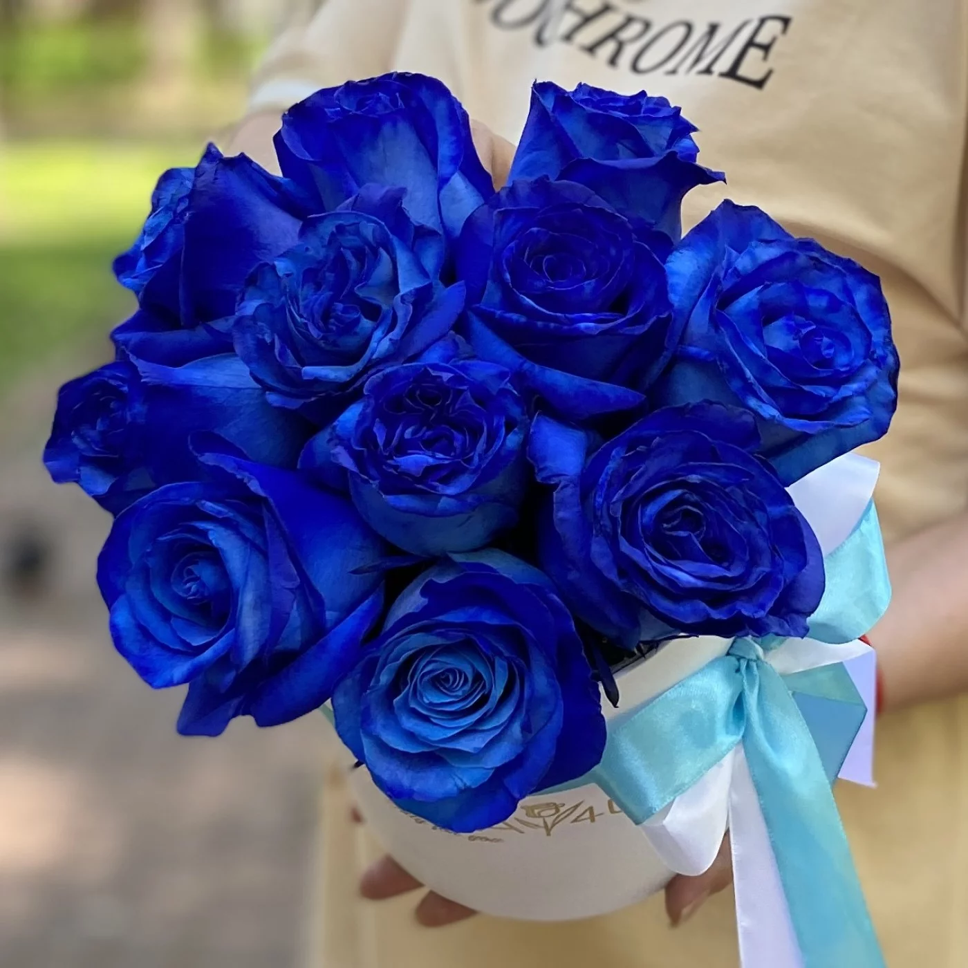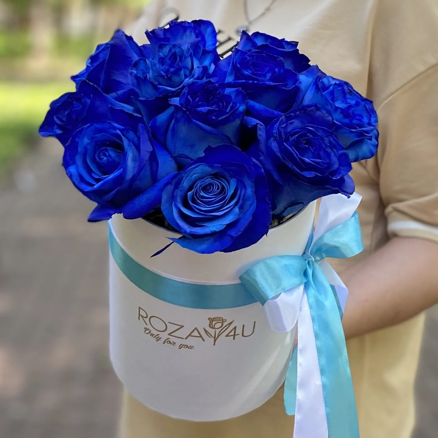 Стильная коробочка из 11 синих роз произведет незабываемое впечатление на Вашу любимую!