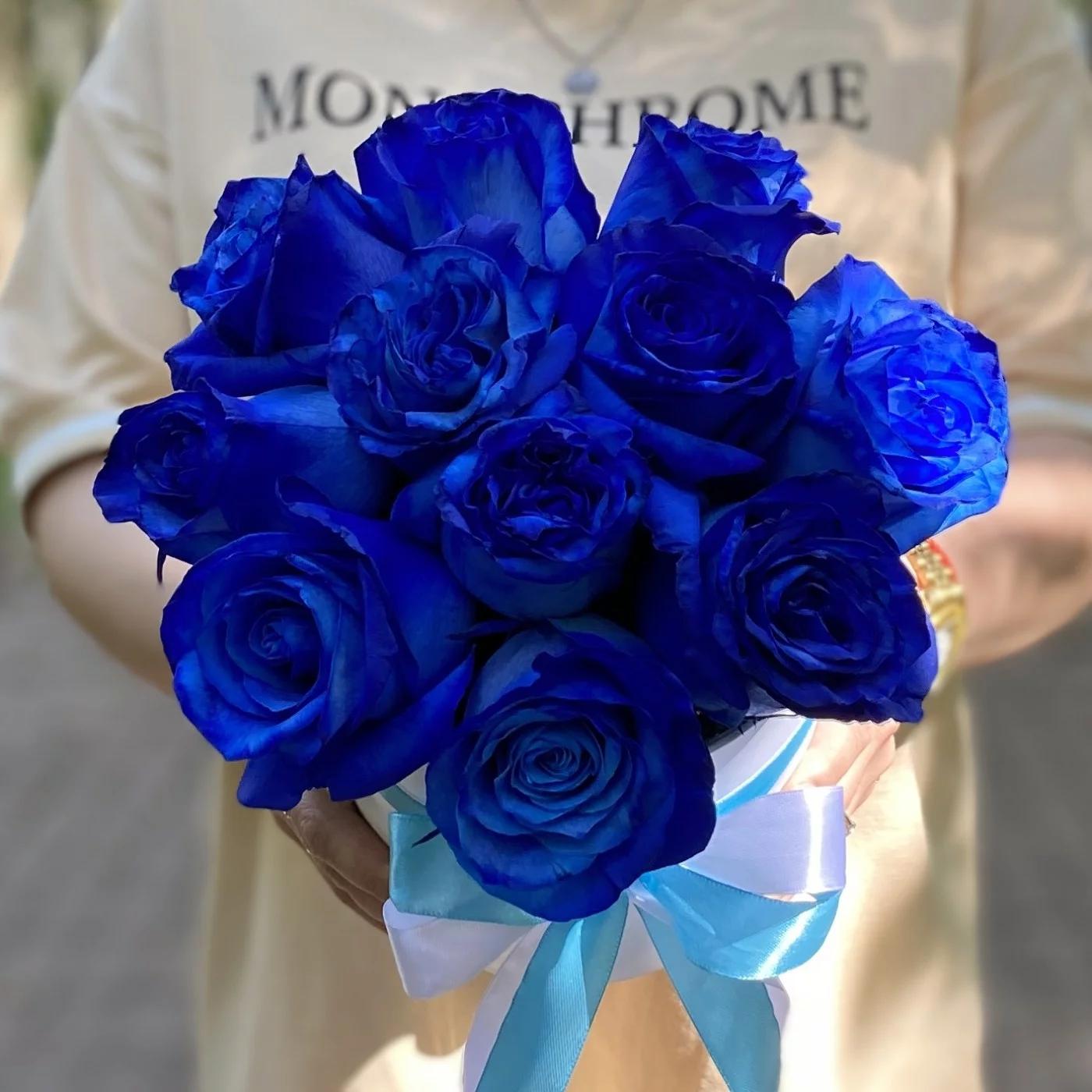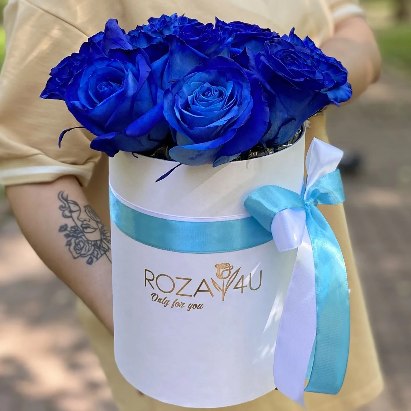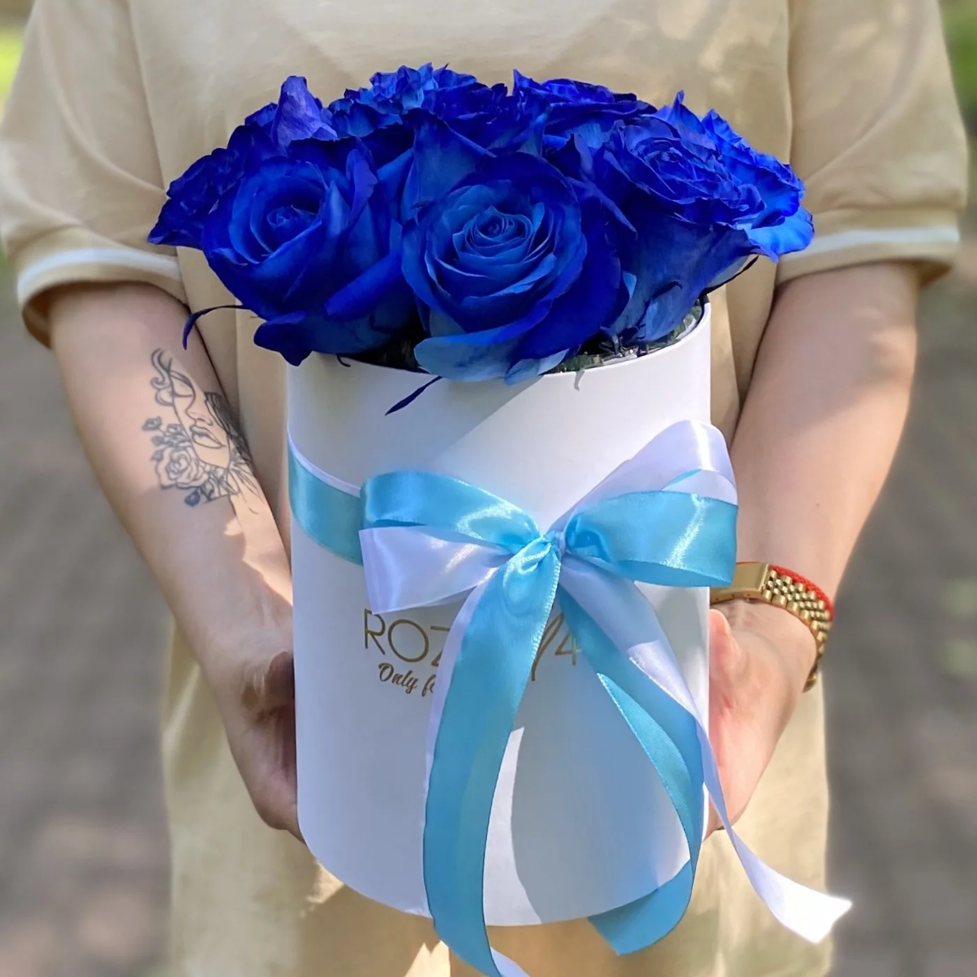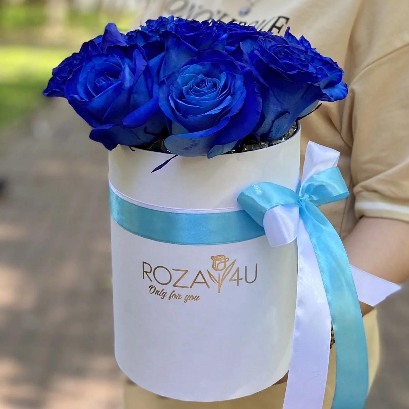 Стильная коробочка из 11 синих роз произведет незабываемое впечатление на Вашу любимую!