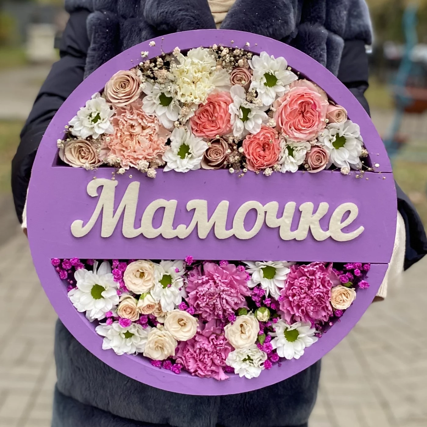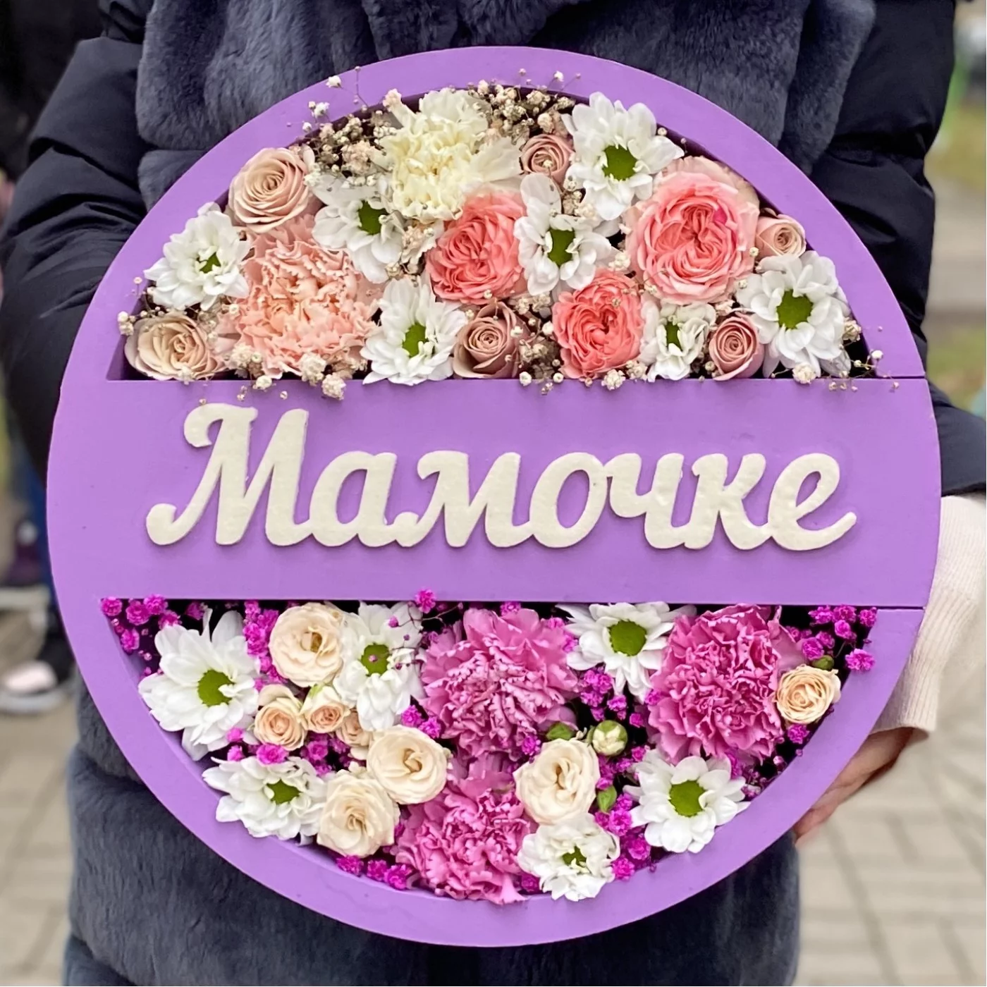 Нежная поляна цветов в сиреновой коробке с надписью Мамочке, станет прекрасным дополнением к подарку или красивым сюрпризом ко дню матери.