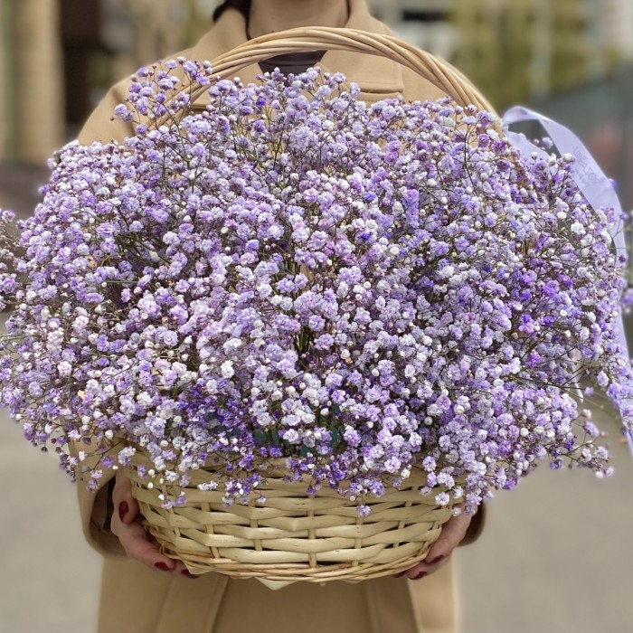 Сиреневая гипсофила в корзине — это нежная композиция, олицетворяющая красоту и элегантность. Это воздушное облако создаёт романтическую атмосферу и является прекрасным подарком для близких.