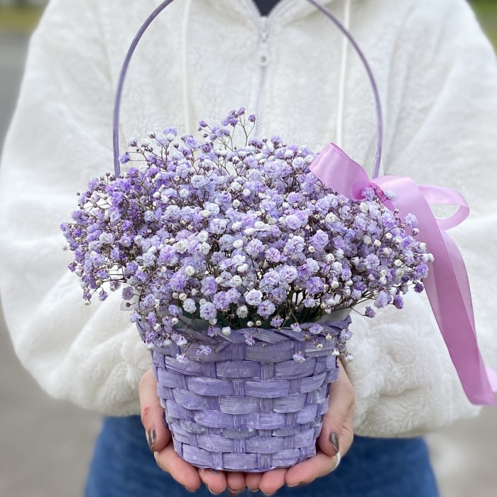 Эта композиция с сиреневой гипсофилой в корзиночке излучает нежность и элегантность. Отличный подарок для поднятия настроения или декорирования уютного пространства. Воздушные цветы добавят атмосферу радости и нежности, идеально подходя для любого повода — от дружеских до романтических встреч.