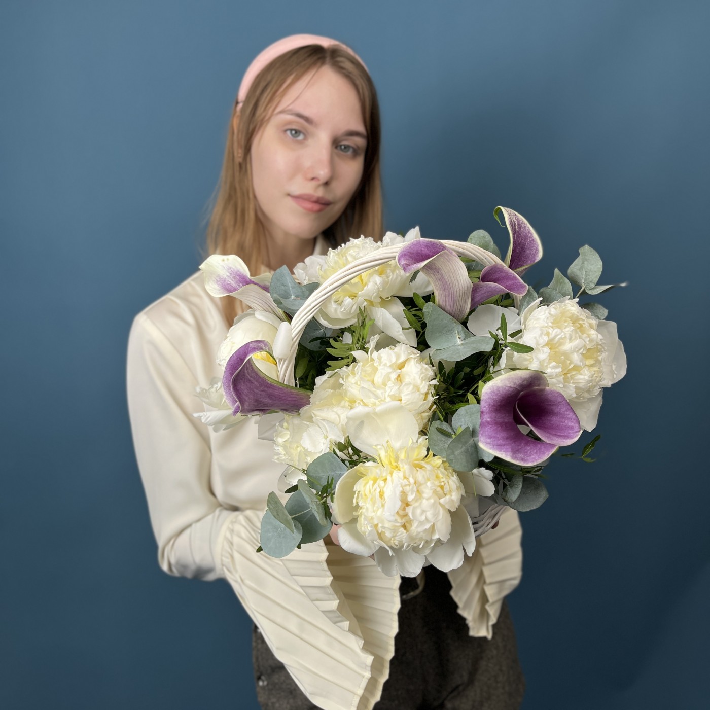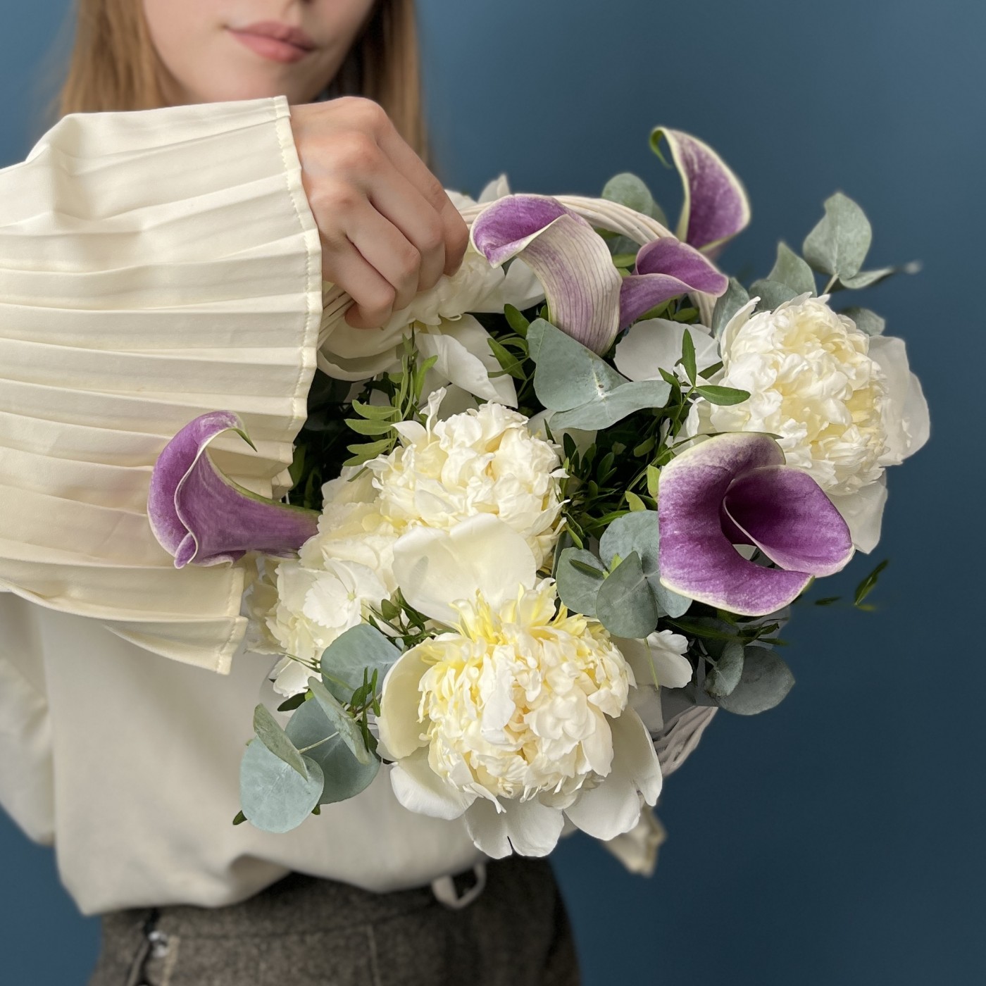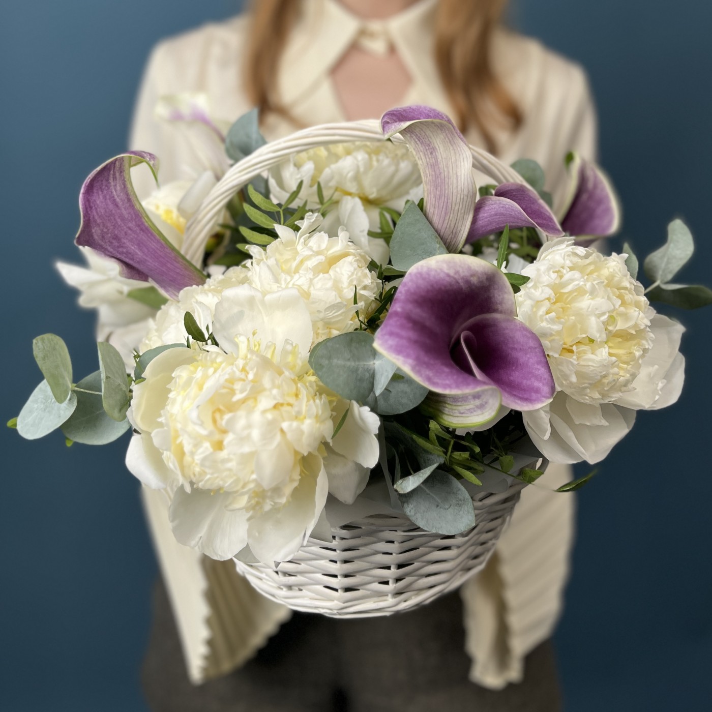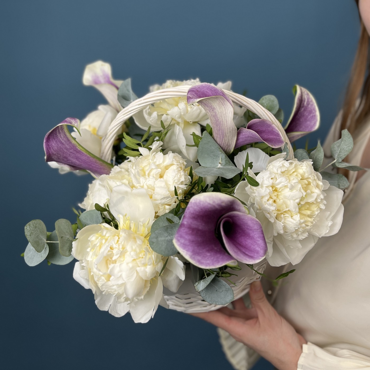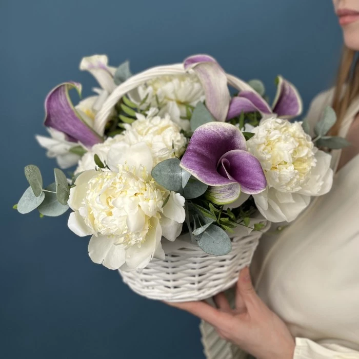 Цветочная композиция Сиреневые каллы с пионами в корзине — это изысканное сочетание элегантных сиреневых калл и пышных пионов, аккуратно размещенных в стильной корзине. Каллы придают композиции утонченность и изящество, а пионовидные цветы добавляют объем и нежность. Такая корзина станет прекрасным подарком для особых случаев, выражением признательности или украшением интерьера. Элегантное сочетание цветов и натуральная подача создают атмосферу уюта и красоты.