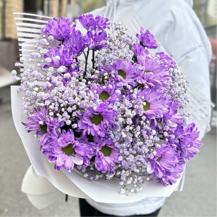 Букет из воздушных сиреневых гипсофил с яркой кустовой хризантемой сиреневого цвета — это элегантная и нежная композиция, которая добавит легкости и свежести в любое пространство.