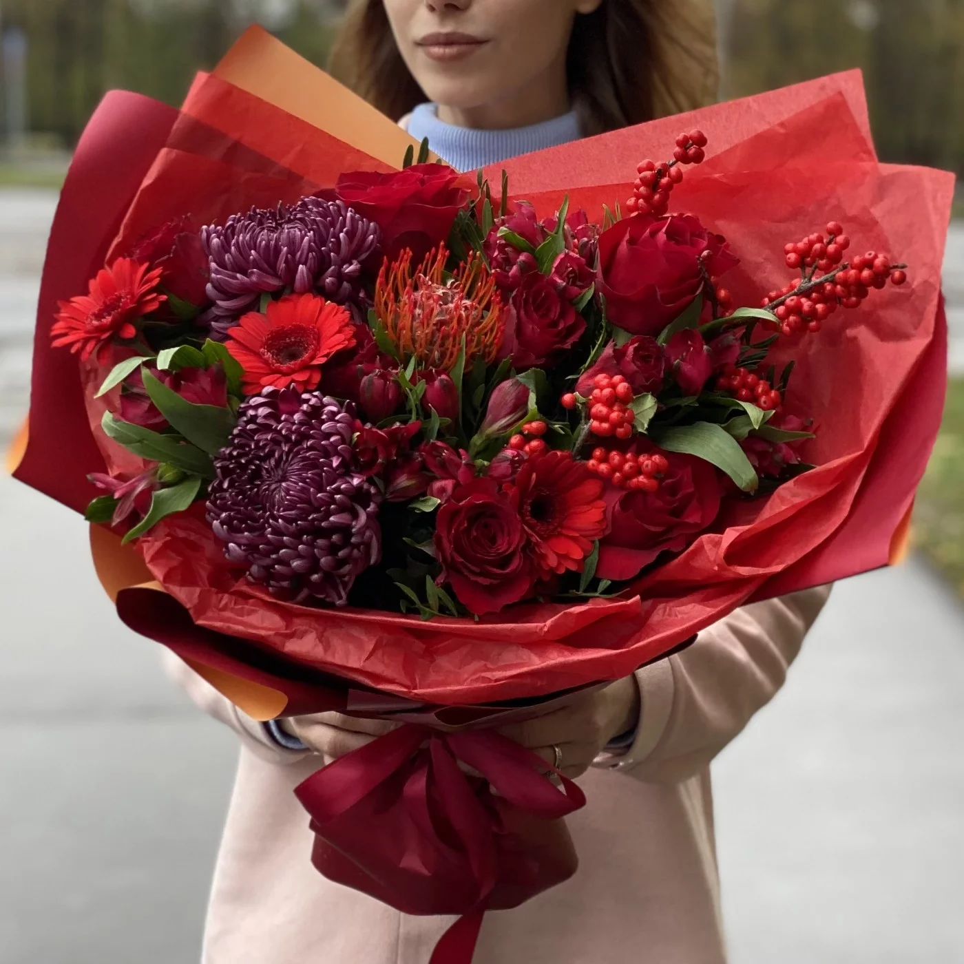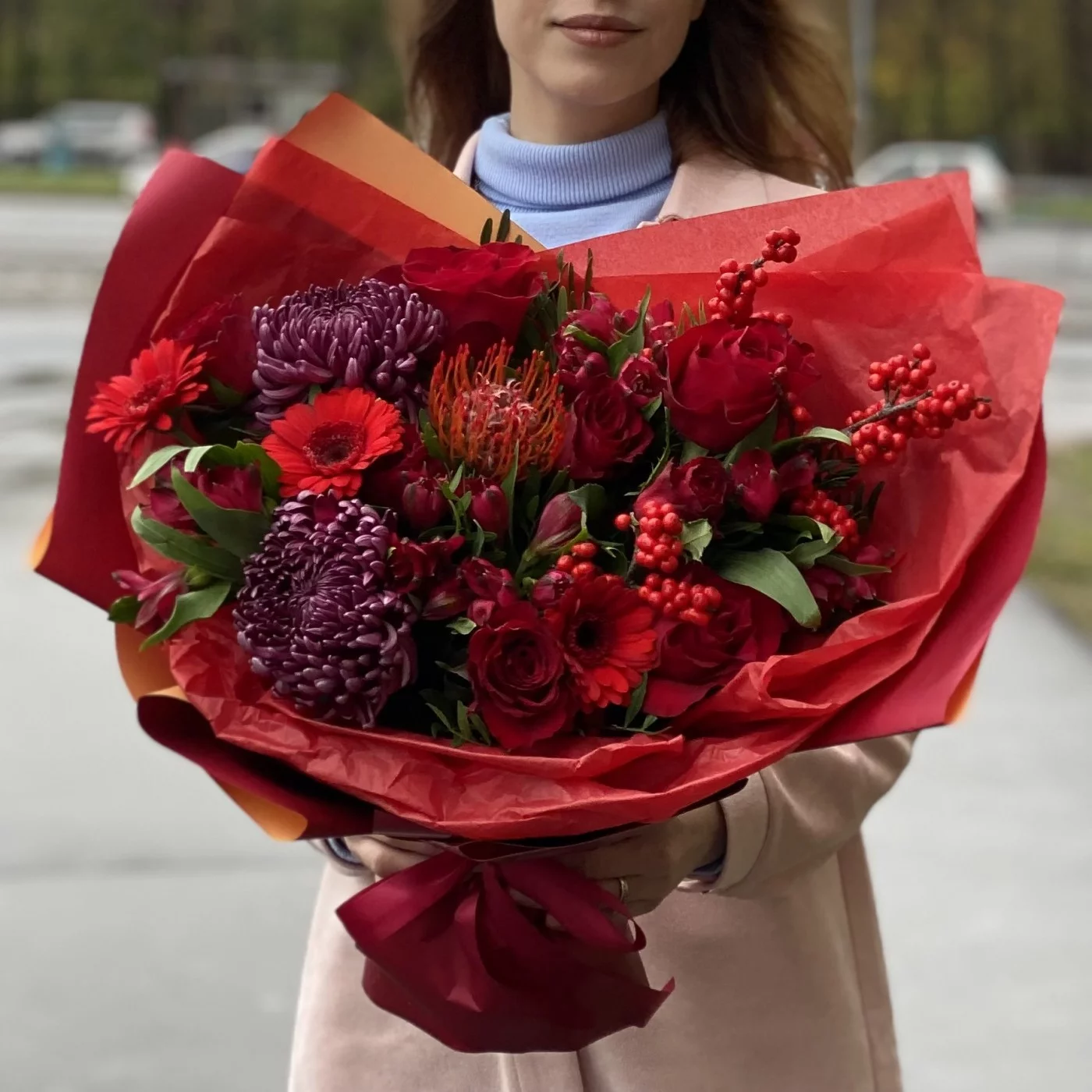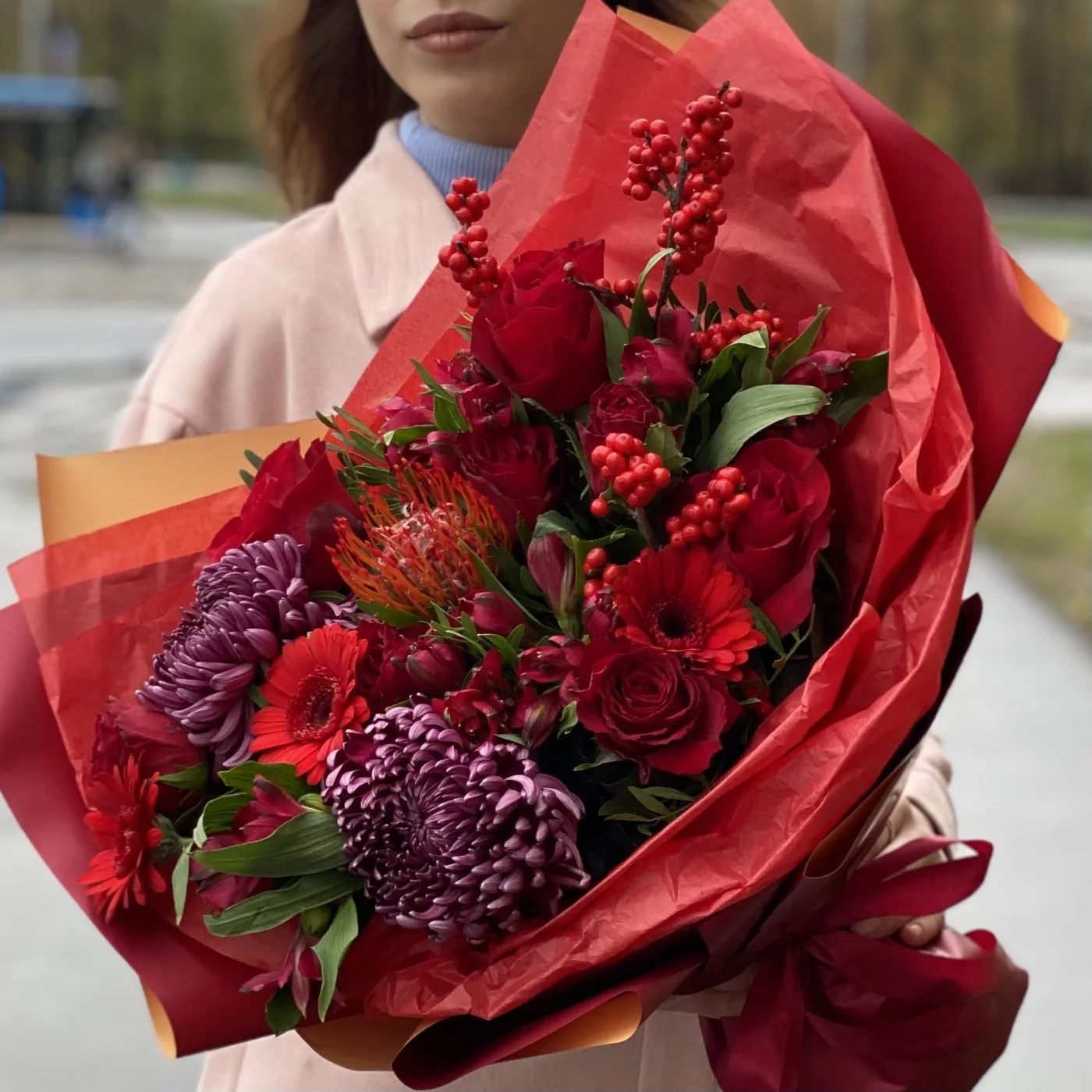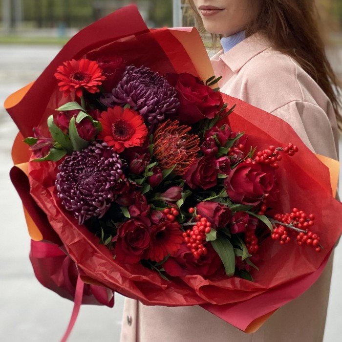 Необычный, страстный ноябрьский букет, который хочется рассмотреть поближе. Яркий подарок самой красивой девушке! Эти цветы способны поднять настроение и рассказать о самых горячих чувствах.