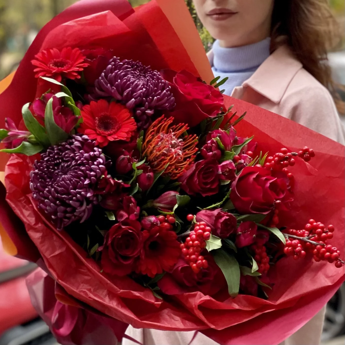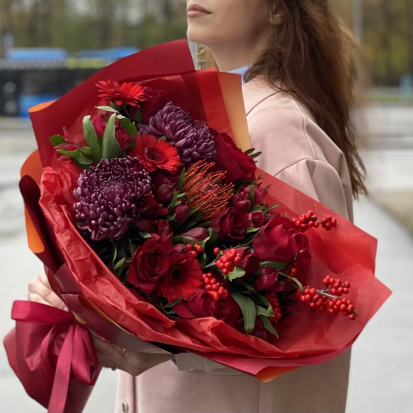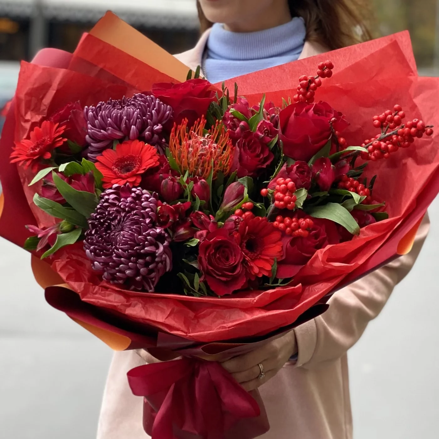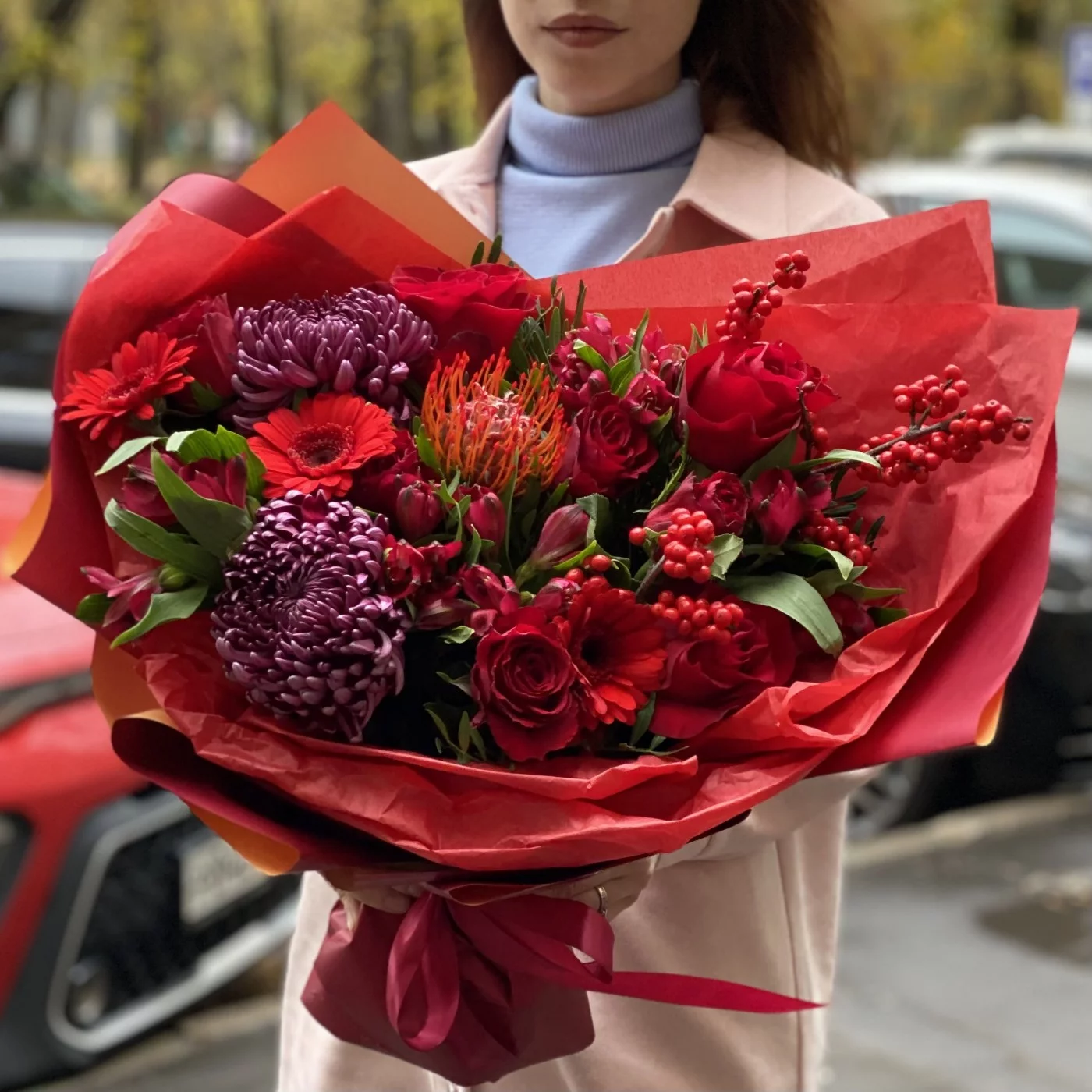 Необычный, страстный ноябрьский букет, который хочется рассмотреть поближе. Яркий подарок самой красивой девушке! Эти цветы способны поднять настроение и рассказать о самых горячих чувствах.
