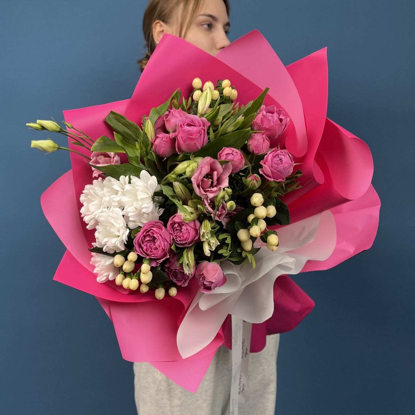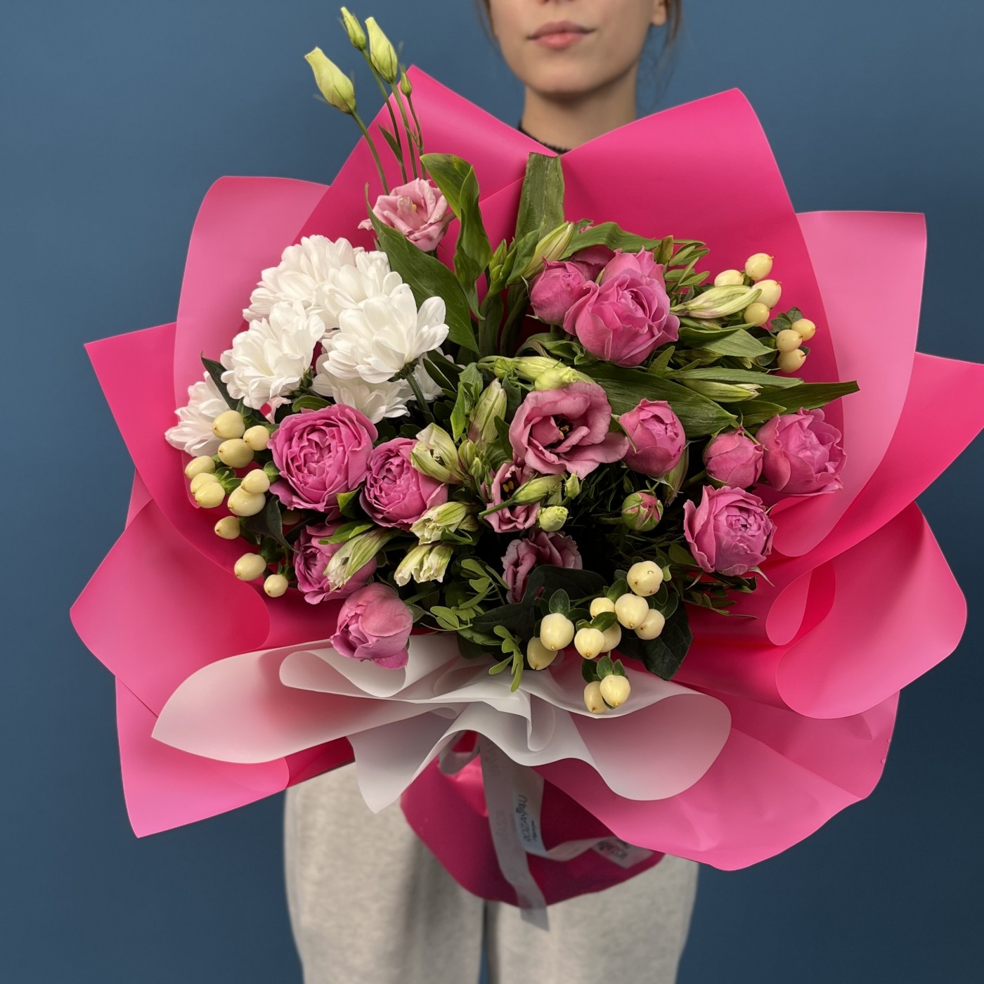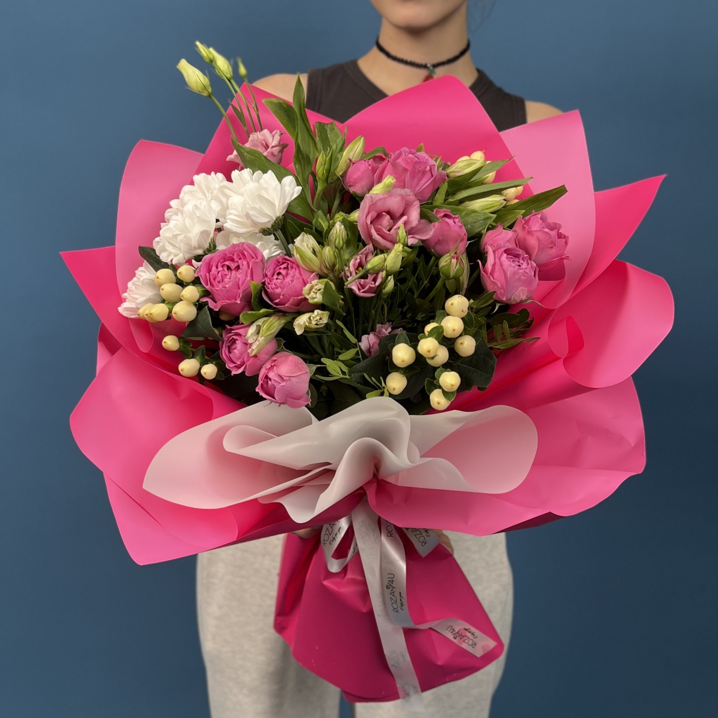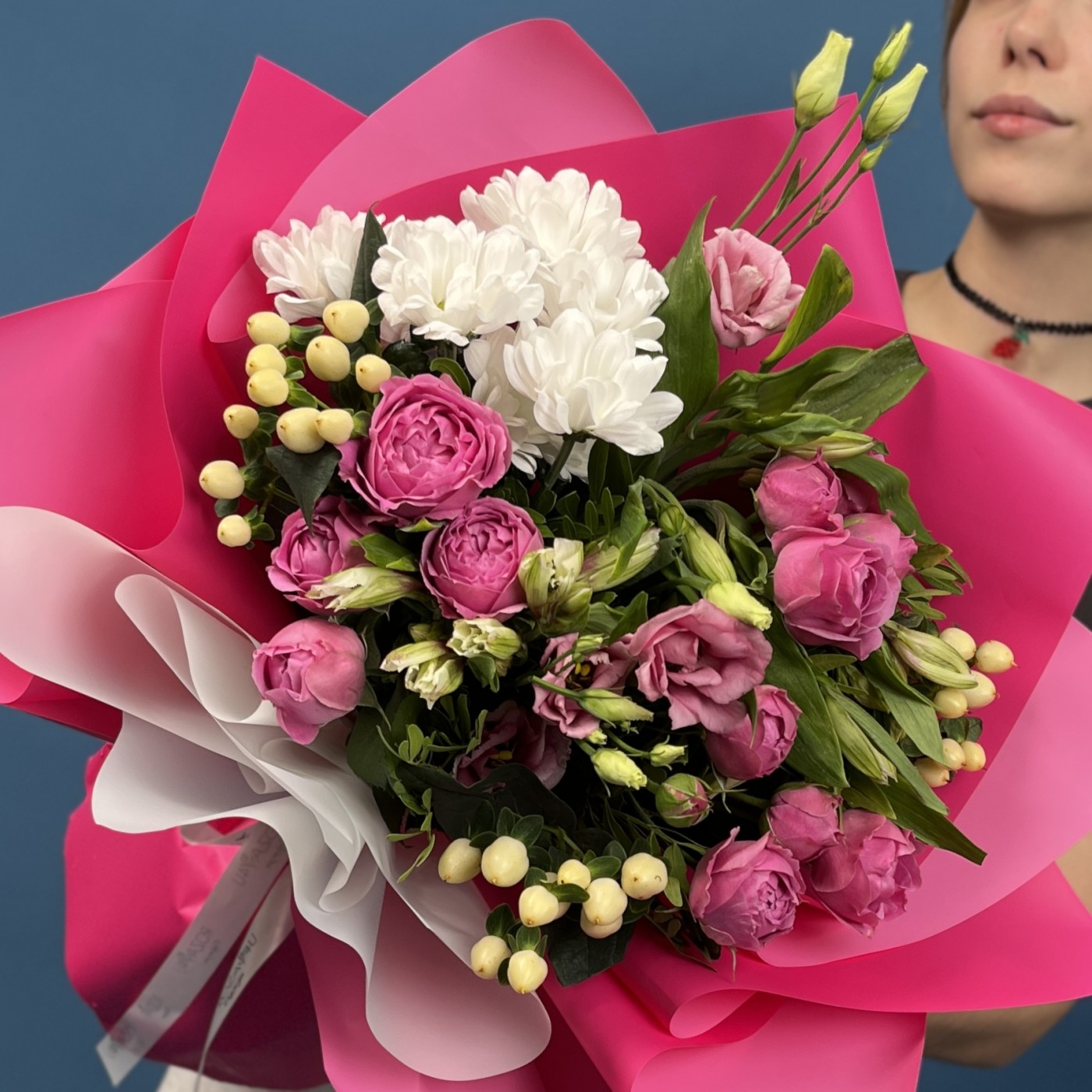 Этот изысканный букет воплощает нежность и романтичность — идеальный выбор для выражения чувств и украшения интерьера. В композицию входят красивые кустовые пионовидные розы, деликатные эустомы и изящные хризантемы, создающие игру текстур и объемов. Всё это собранно в элегантную и сбалансированную композицию, которая добавит в ваш дом или подарок ощущение свежести, тепла и романтики.