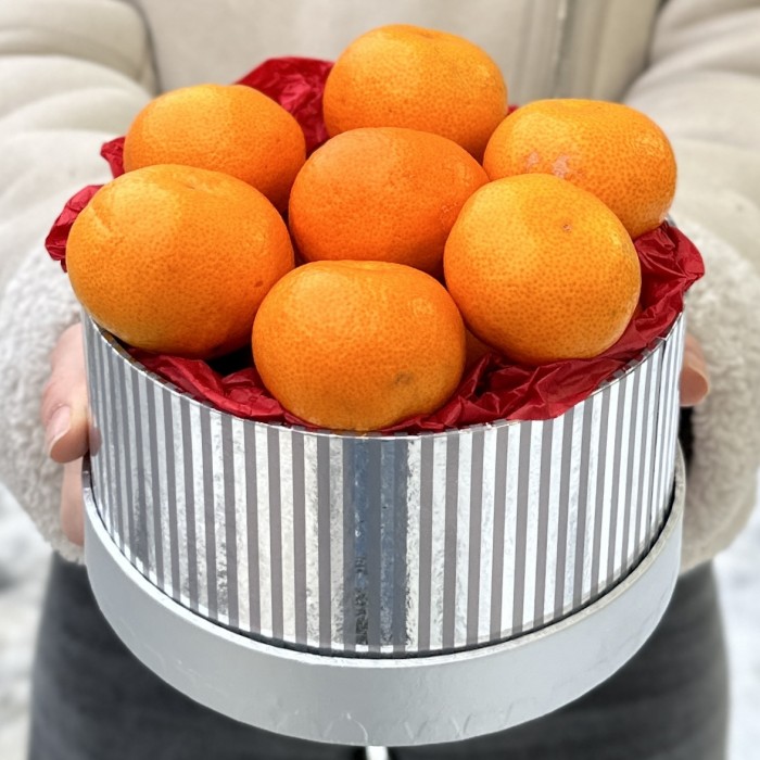 Приятный презент в новогодние праздники. Композиция в коробке с яркими и ароматными мандаринками. Такую композиция можно приобрести для корпоративных мероприятий и поздравления сотрудников, друзьям или любимой семье.