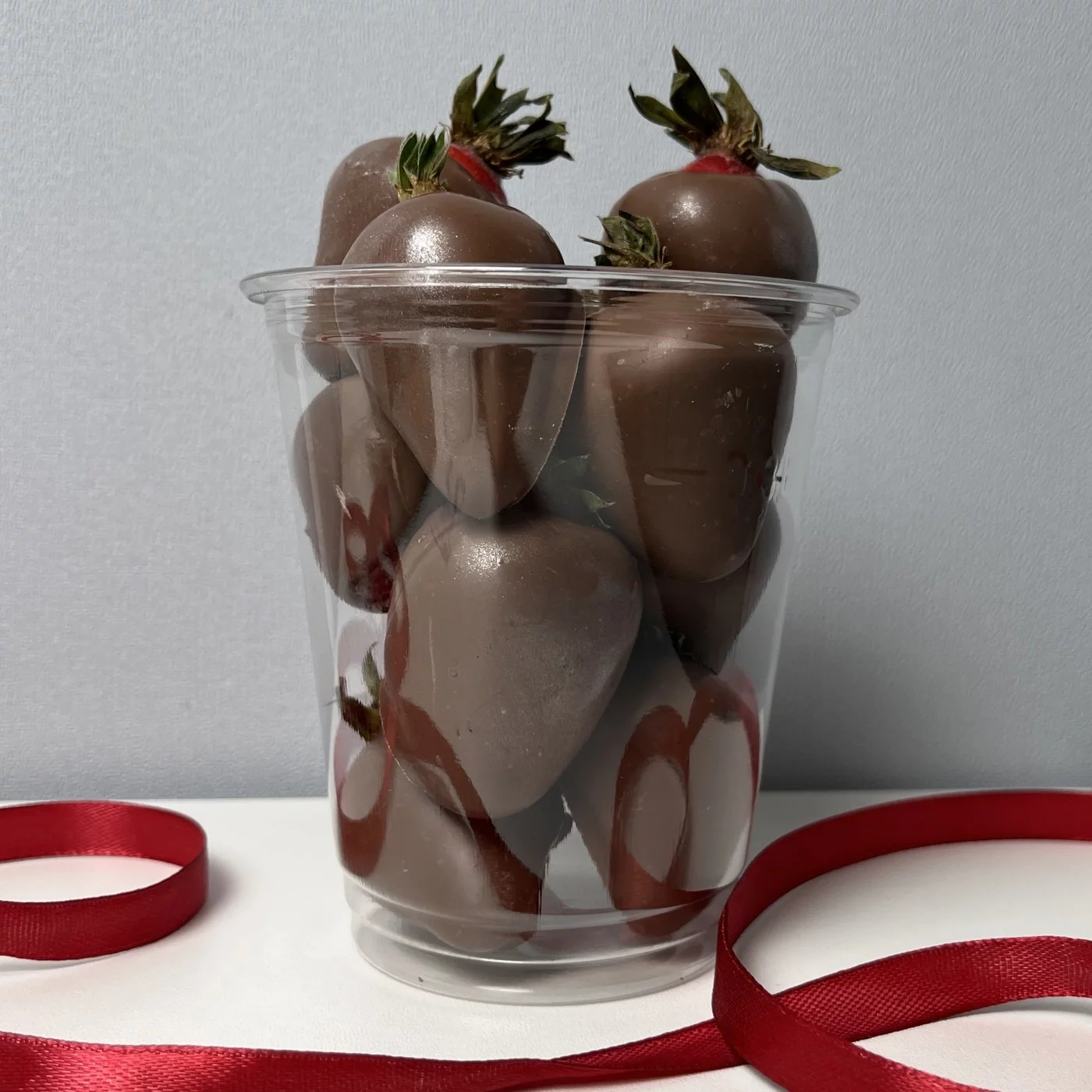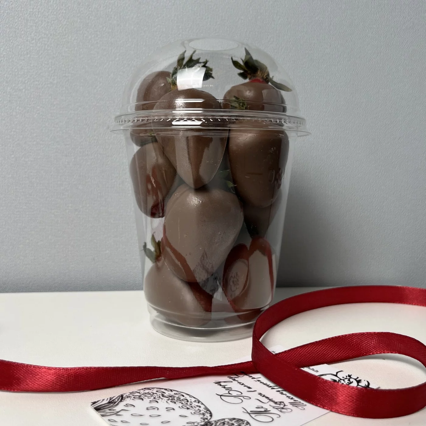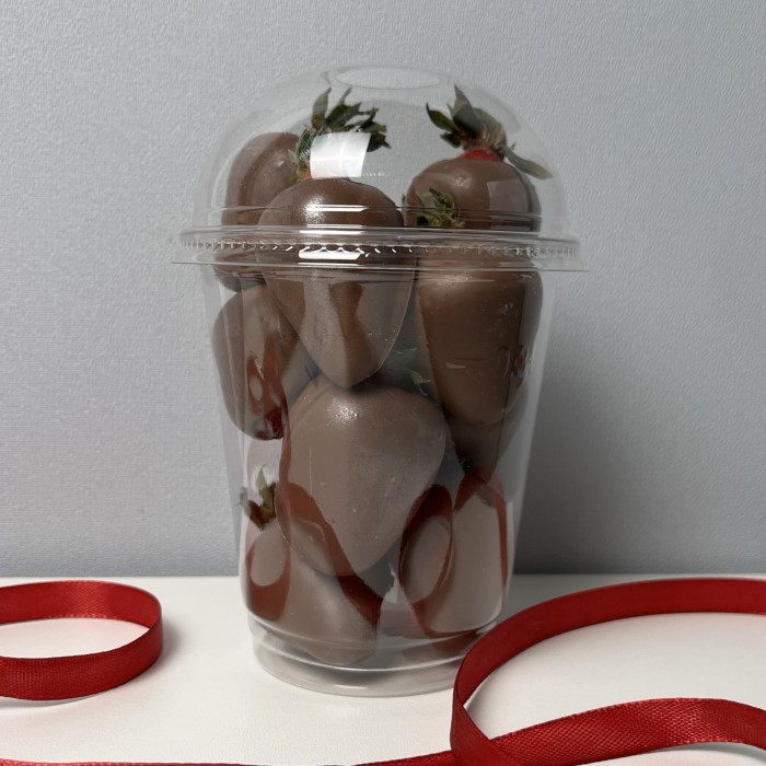 Стаканчик с клубникой в молочном шоколаде классика 300 мл, станет вкусным и красивым дополнением к букету ароматных роз.