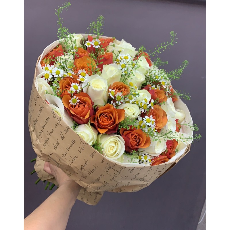 Состав букета: Роза 40 см белая – 22 шт, роза 40 см оранжевая – 23 шт, танацетум – 7 шт, гринбел – 3 шт, упаковка