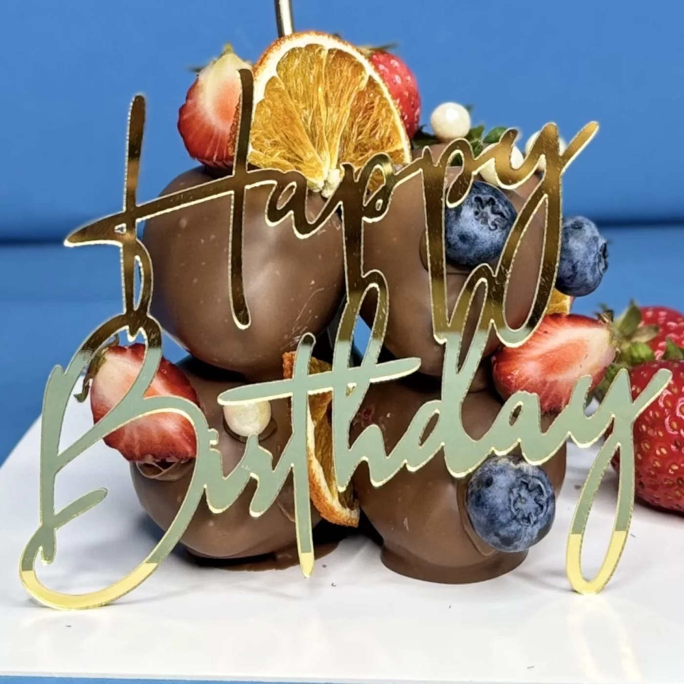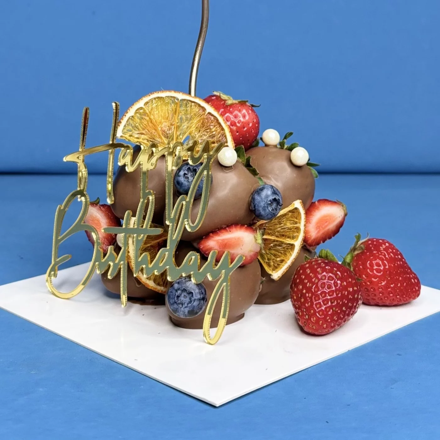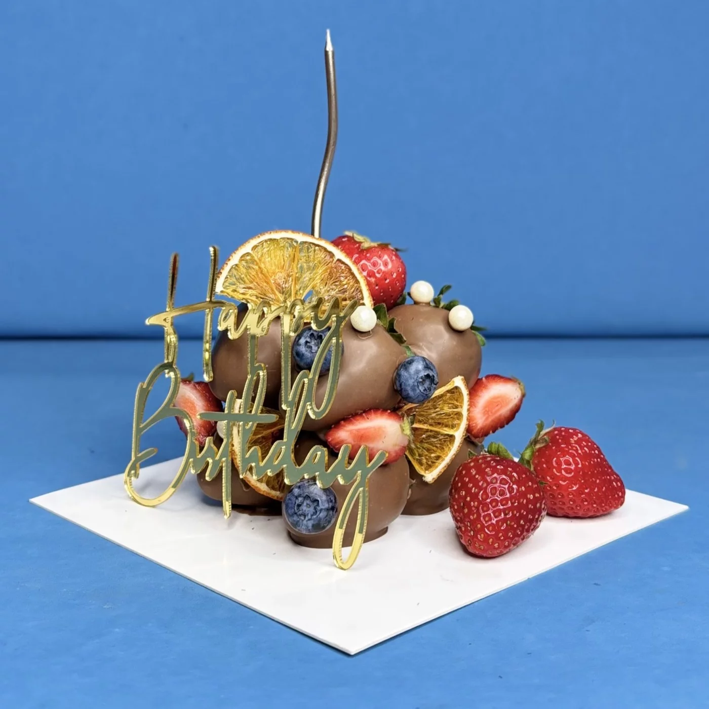 В набор входит: торт из клубники 1,5 кг, малина, голубика, свечка, топпер, коробка для торта.