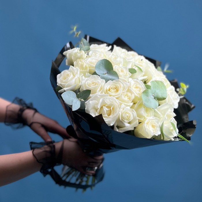Траурный букет из белых роз дополненный веточками эвкалипта выполнен в строгой черной упаковке. Белые розы символизируют чистоту, невинность и вечную память, а мягкий аромат эвкалипта придает композиции особую утонченность и спокойствие.