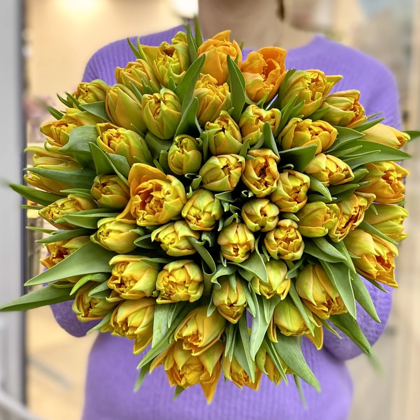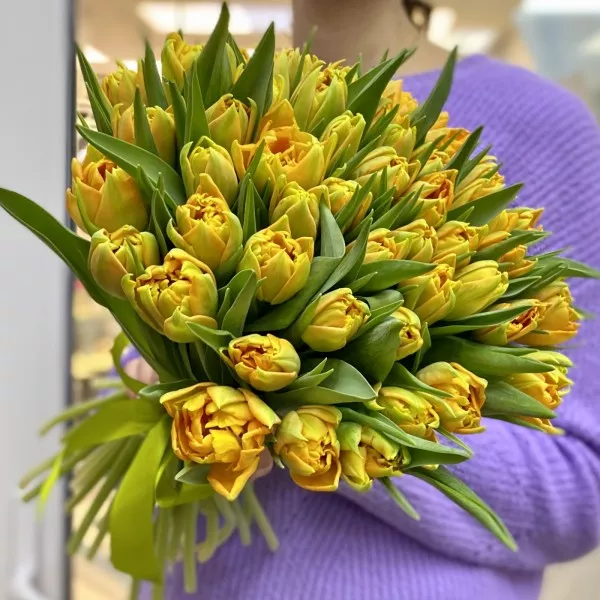 На фото представлен букет из 55 тюльпанов в упаковке