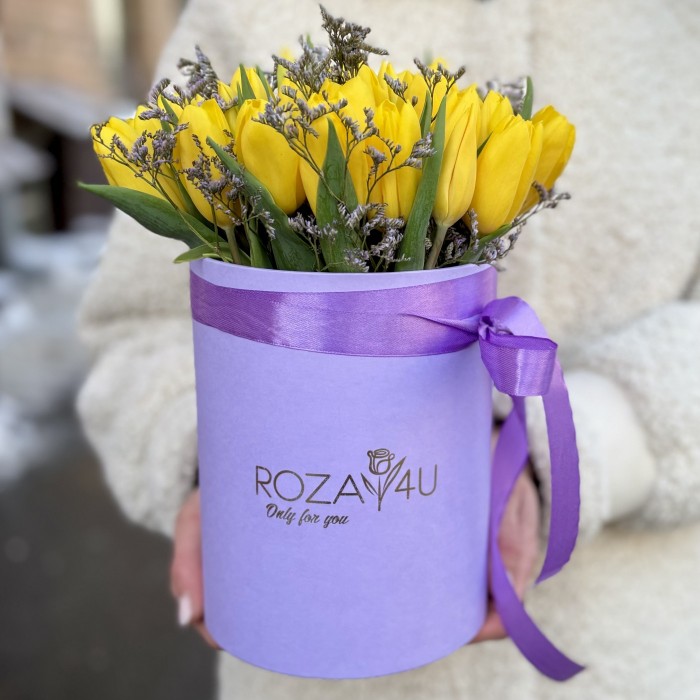 Тюльпаны в коробке - это неповторимый подарок по любому поводу. Яркие желтые тюльпаны станут прекрасным украшением торжества.