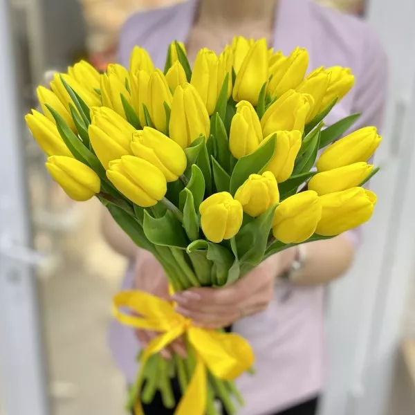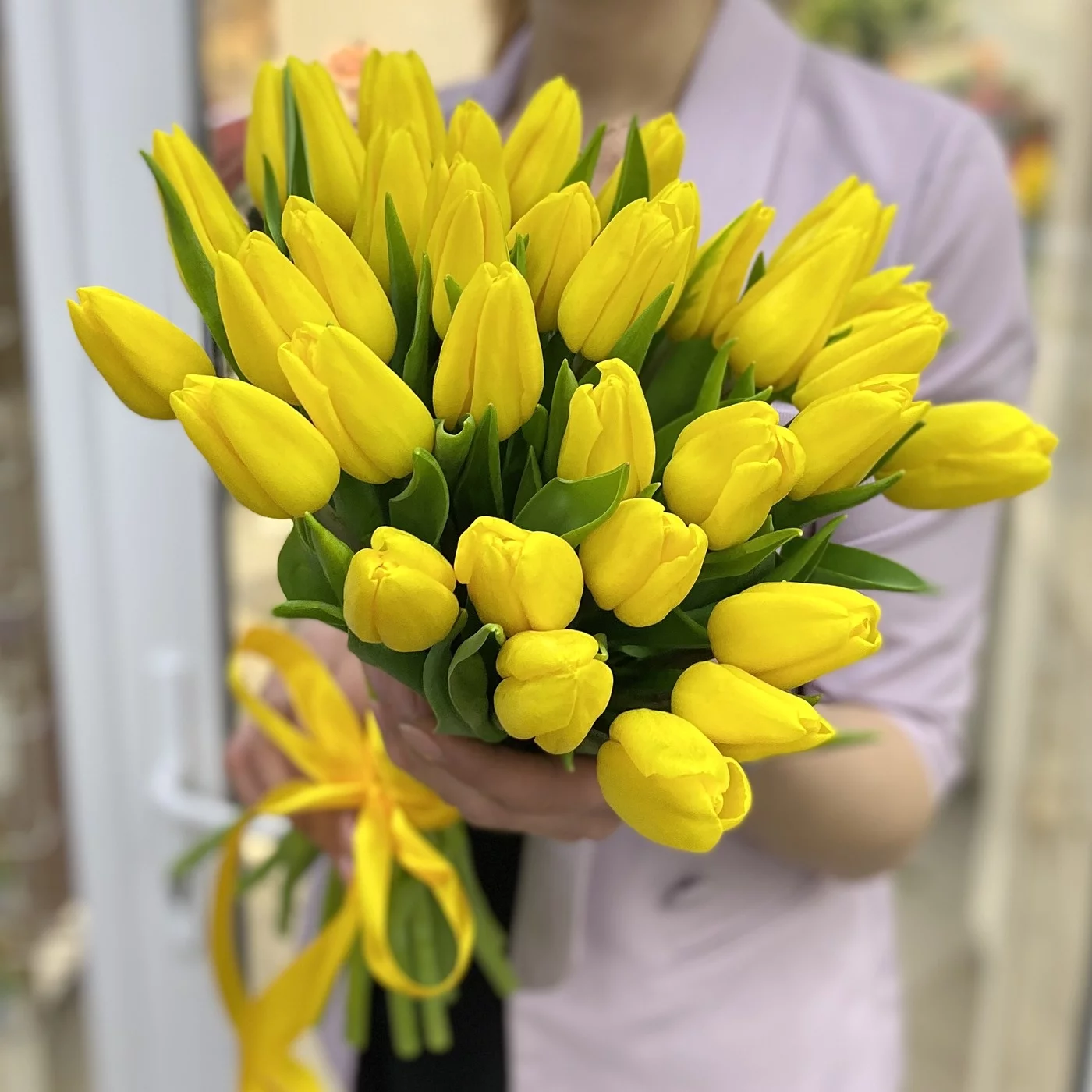 Желтые тюльпаны – символ весны. Создайте весеннюю атмосферу с помощью цветов в доме, на работе или любом другом пространстве. На фото представлен букет из 35 тюльпанов.