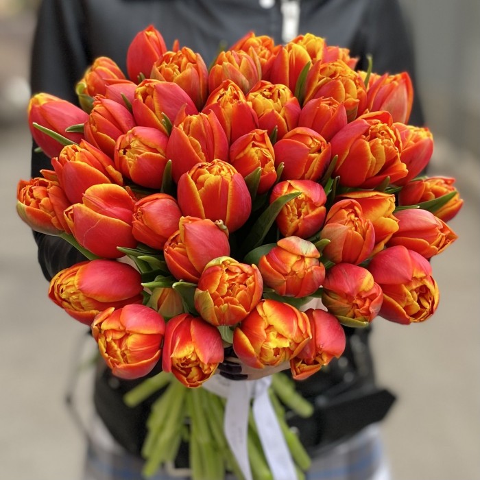 Пионовидные оранжево-жёлтые тюльпаны Мира — яркий и изысканный подарок на самые важные события в жизни. Аккуратные бутоны среднего размера имеют много лепестков, что придает цветам пышности и изящества. В момент доставки бутоны свежи и упруги, они еще долго будут раскрываться в вазе, меняя оттенок цвета и силуэта.