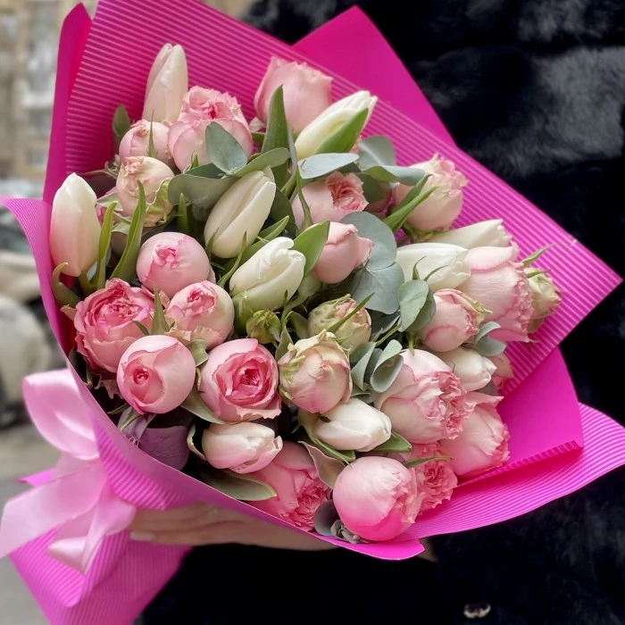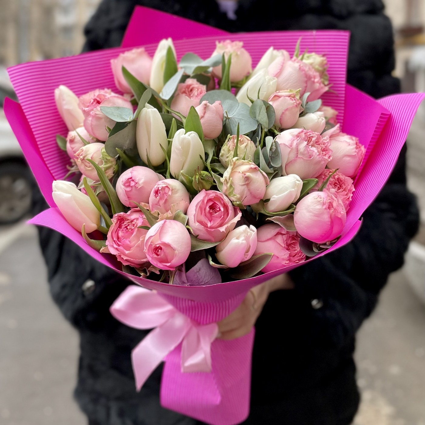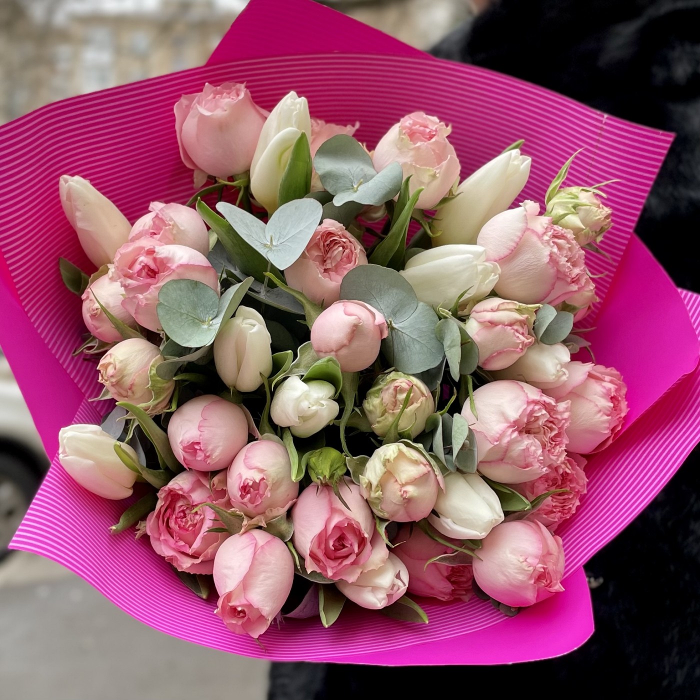 Весенний букет Розовое настроение. Прекрасное сочетание пионовидных роз и ароматных тюльпанов. Сделай приятный сюрприз своим родным и близким.