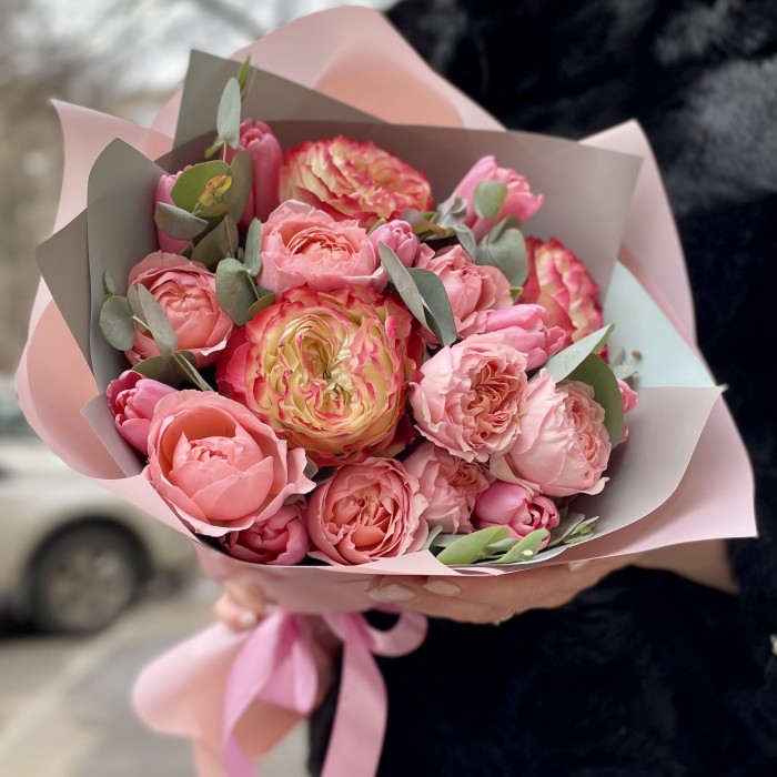 Весенний букет Пионовидных роз. Прекрасное сочетание пионовидных роз и ароматных тюльпанов. Сделай приятный сюрприз своим родным и близким.